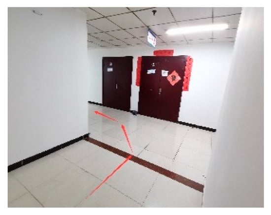 The experiment was carried out in a corridor environment (Figure 18) using a shopping cart platform (Figure 19). To accurately record the absolute trajectories of both the leader and the following vehicle for analysis, a UWB-based global reference positioning system was deployed in the corridor environment. In the world coordinate system, the origin was set at the rear corner of the corridor, with the X-axis aligned along the corridor, the Y-axis perpendicular to the corridor, and the Z-axis vertical upward. For data recording, an additional set of positioning base stations was fixed at point (0, 0, 2.6) in the experimental area to serve as the main base station. Both the vehicle and the leader carried a positioning tag for localization within the environment, enabling the recording of their trajectory points. During the experiment, the operator held the UWB positioning tag of the autonomous following system to act as the leader and provide a target for the vehicle to follow. Figure 20 shows the autonomous following experiment in progress, capturing the vehicle following the leader’s movement.