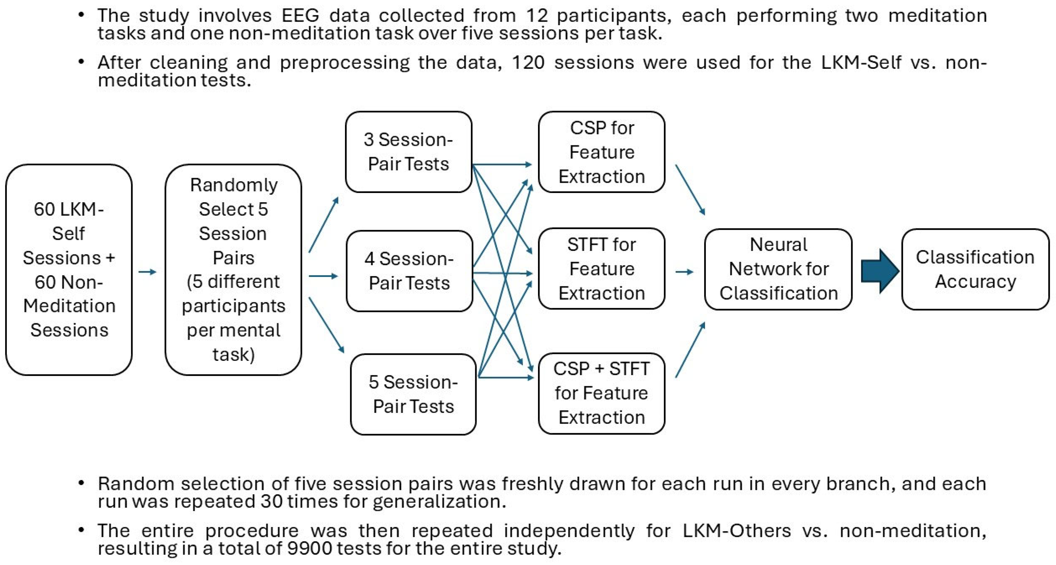 The cleaned data consists of 180 sessions from 12 participants. Since we are working on inter-subject classification, we first modelled this dataset into three groups corresponding to the three mental tasks. Specifically, 60 sessions of data were assigned to LKM-Self, LKM-Others, and non-meditation, with each group containing 5 sessions of EEG data from a single participant. Two independent studies were conducted to classify LKM-Self vs. non-meditation and LKM-Others vs. non-meditation. Since the procedures were the same for both cases, the description is provided only for the LKM-Self vs. non-meditation classification.