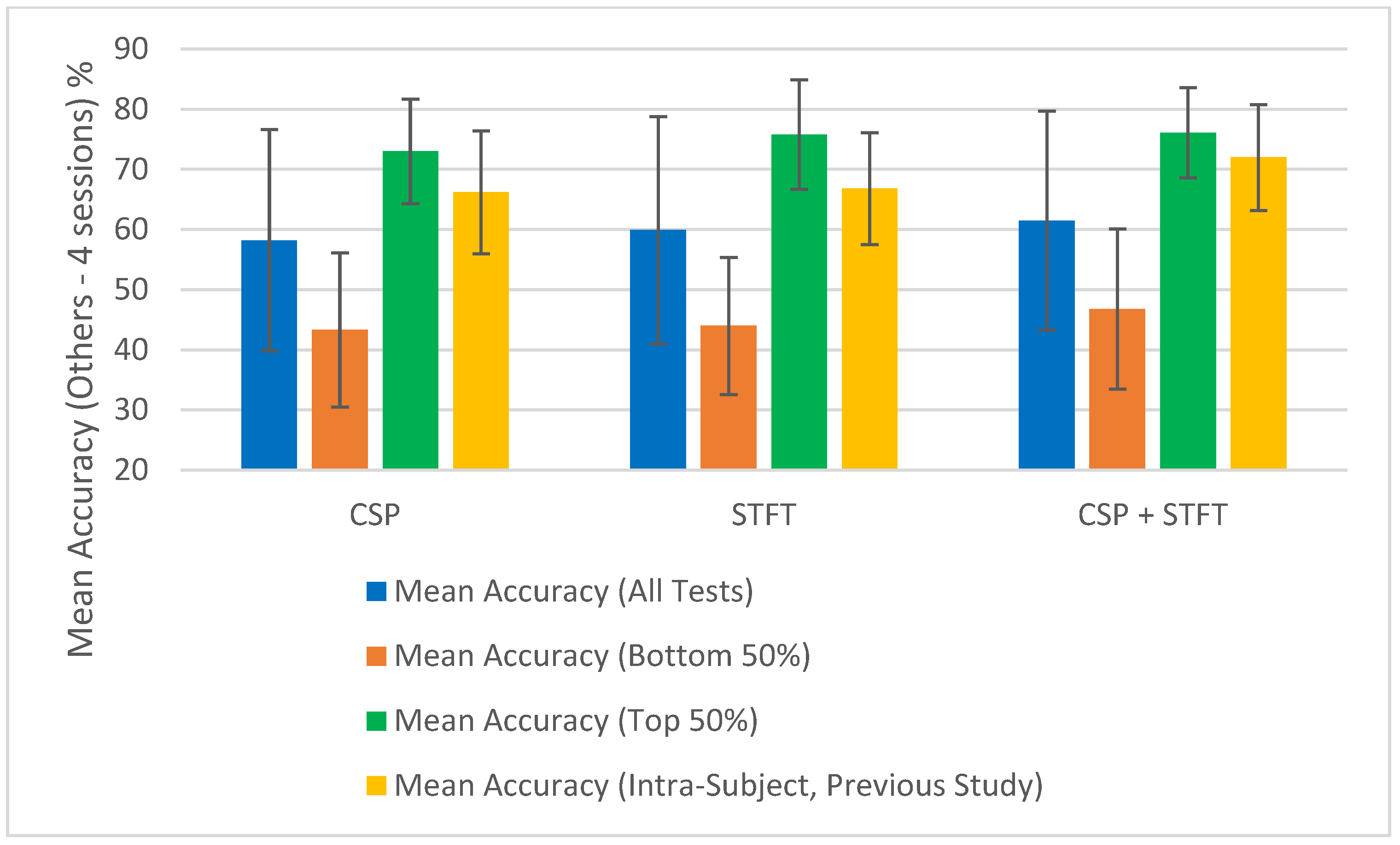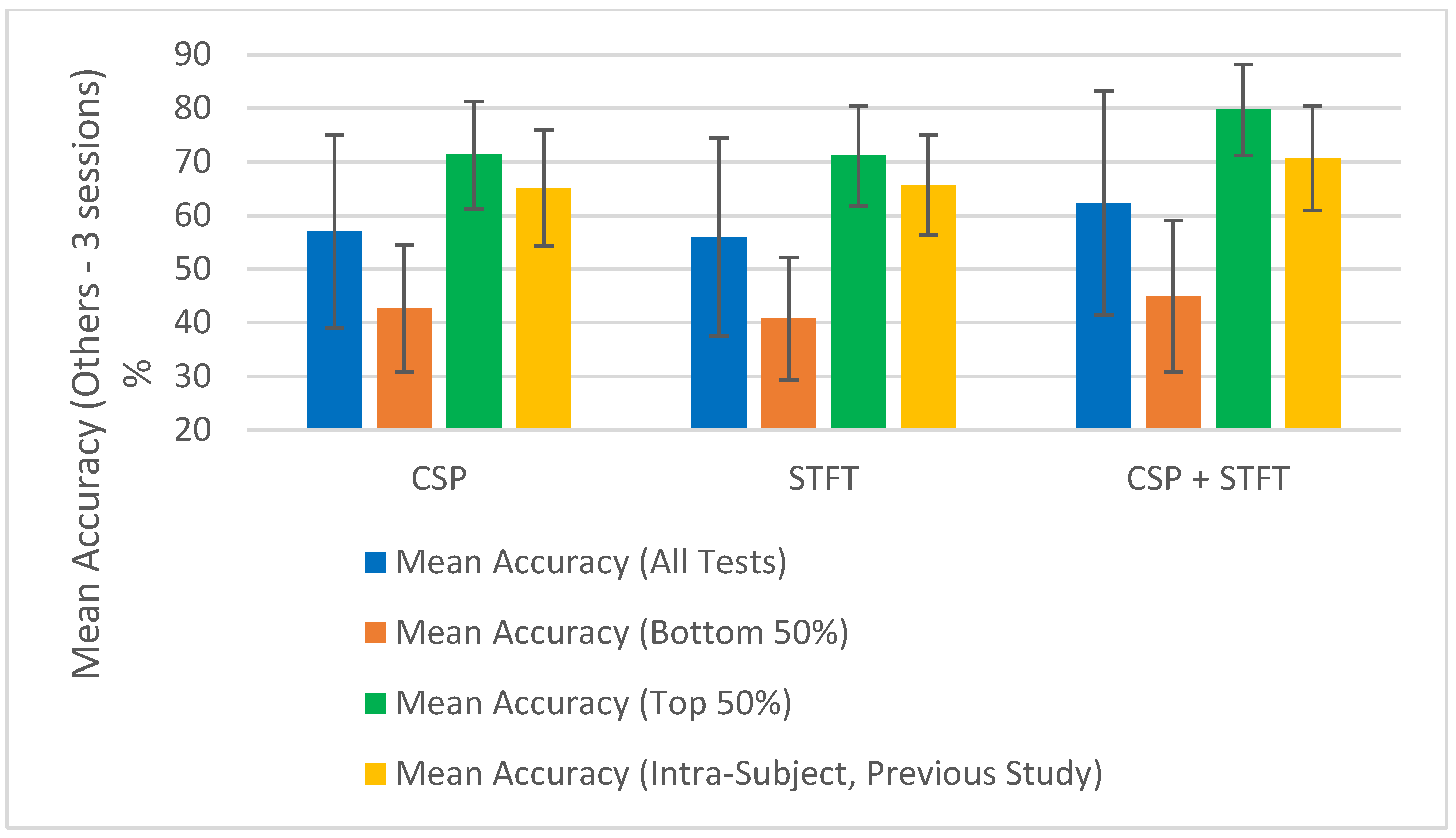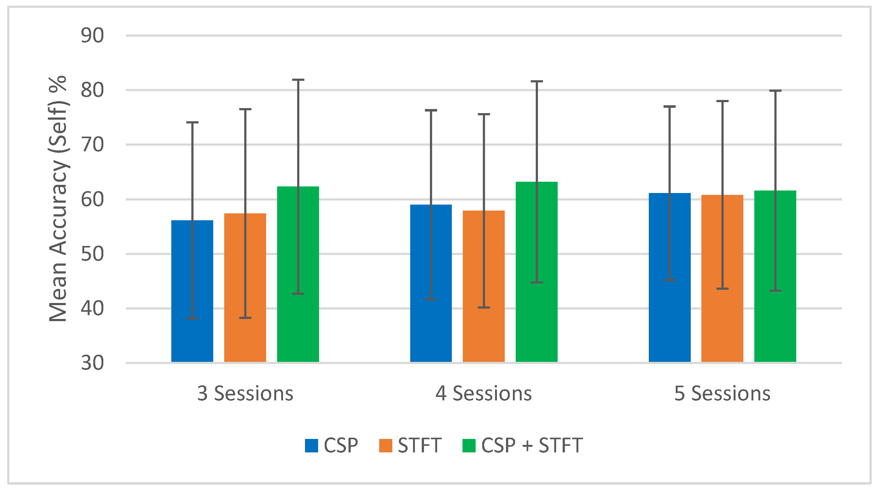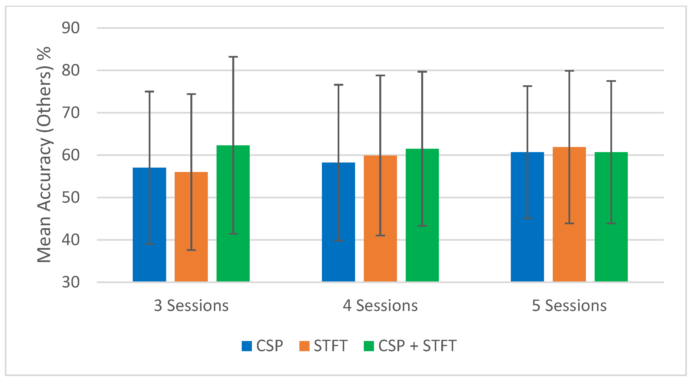 Figure 4), the CSP + STFT pipeline significantly outperforms the others for three- and four-session pairs, and it performs slightly better in the five-session pair case. An increase in the number of training pairs generally improves accuracy for CSP and STFT, while for CSP + STFT, the improvement is seen mainly when comparing 3 to 4 session pairs. Overall, in 5 out of 6 cases where session pairs increased, classification accuracy improved.