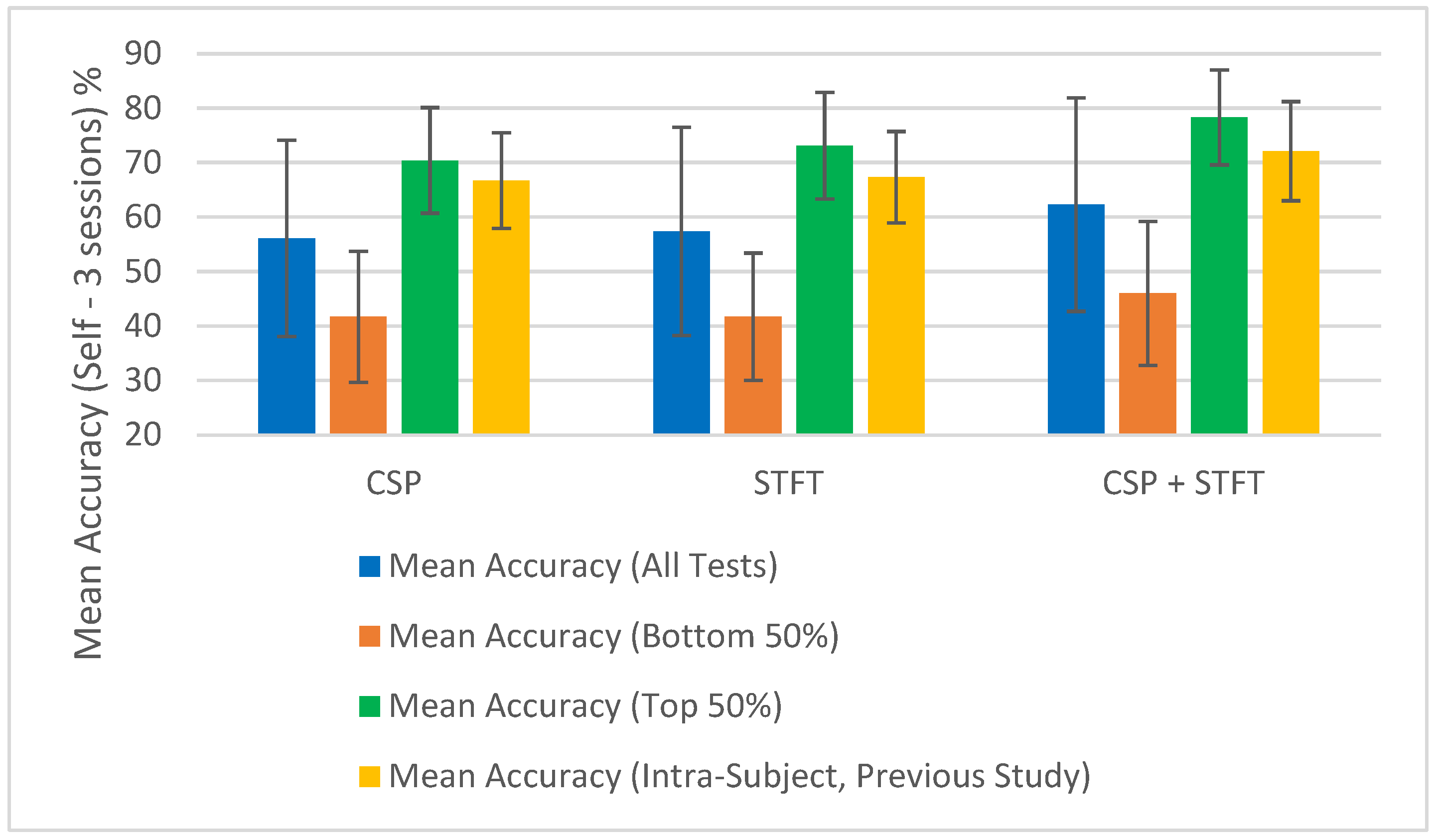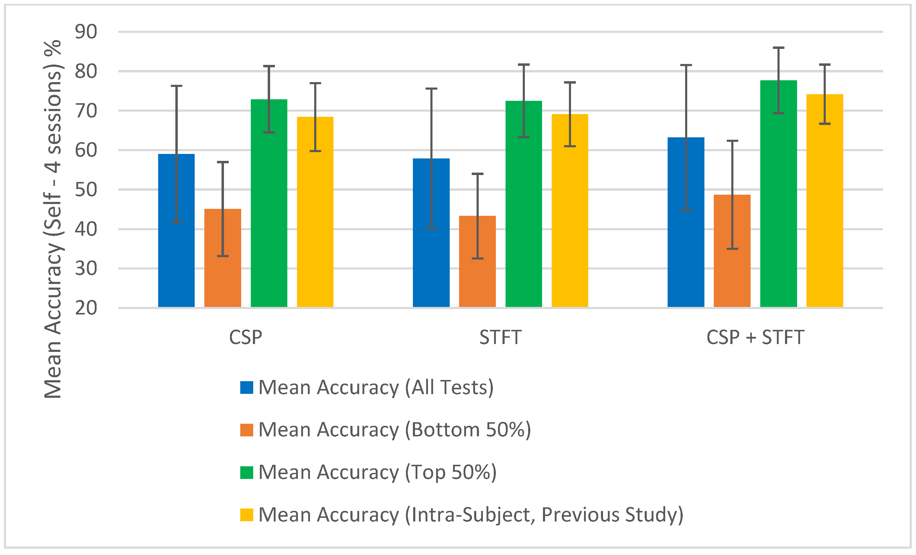 Table 1 presents the average classification accuracies obtained for LKM-Self vs. non-meditation EEG data using three session pairs based on 30 independent experiments conducted for each of the three BCI pipelines with different feature extraction methods: CSP, STFT, and a fusion of CSP and STFT. Each of these 30 experiments consists of 30 independent tests, and each row in the table shows the average accuracy and uncertainty for those 30 tests across the three BCI pipelines. For all 2700 (30 × 30 × 3) tests conducted, two session pairs were used for training the machine learning algorithm, and one session pair was used for testing the algorithm. The “Mean Accuracy (All Tests)” provides the average accuracy and uncertainty for all 900 tests conducted for each BCI pipeline. Since we observed a significant level of uncertainty for each pipeline across the 900 tests, we calculated the “Mean Accuracy (Bottom 50%)” and the “Mean Accuracy (Top 50%)” of these 900 tests. These mean accuracies and uncertainties are displayed at the bottom of