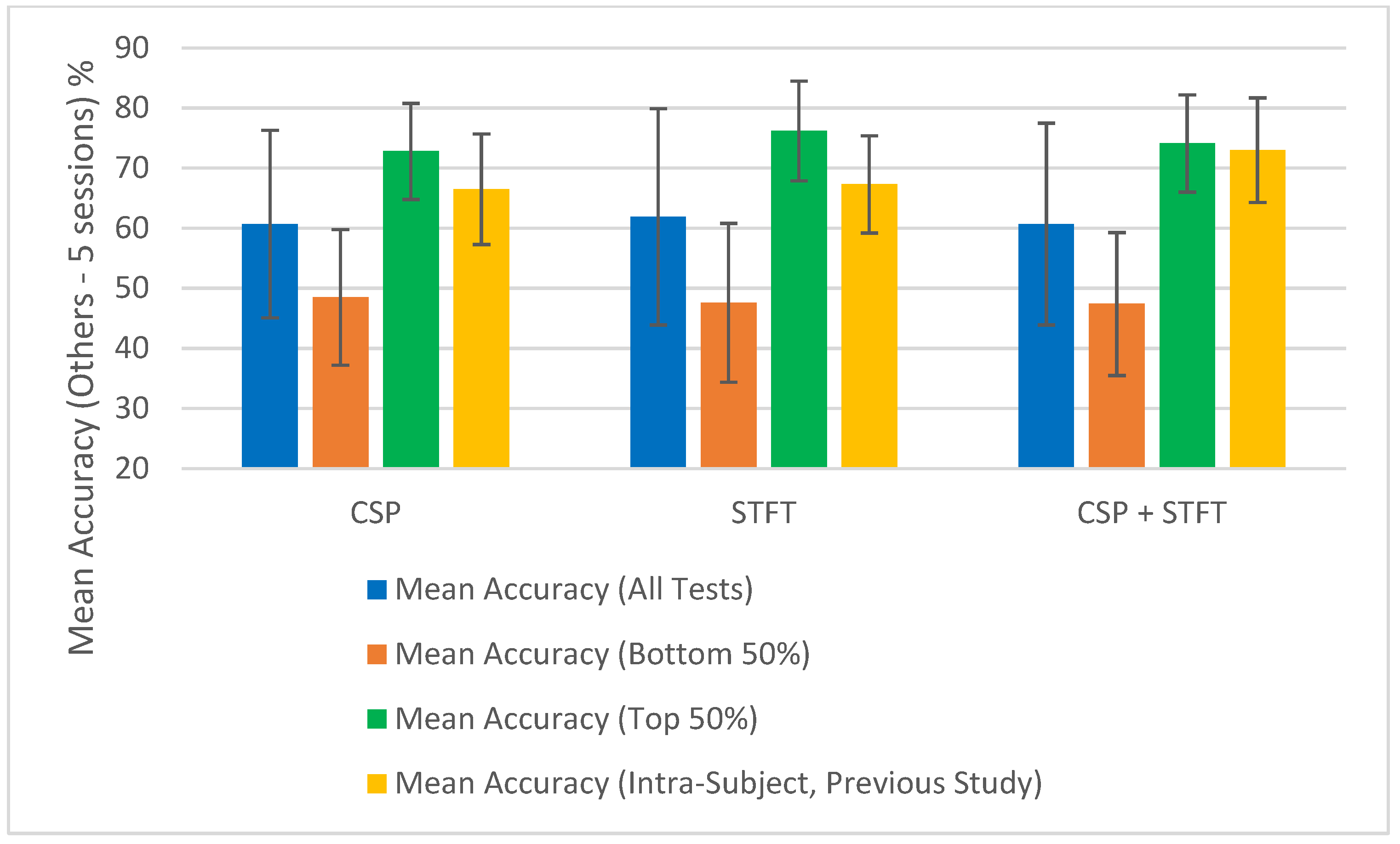 Figure 5), CSP + STFT outperforms the others in the three- and four-session pair cases, while STFT performs best in the five-session pair case. As with LKM-Self, increasing session pairs usually improved classification accuracy for CSP and STFT but not consistently for CSP + STFT. Here, 4 out of 6 cases showed improvements.