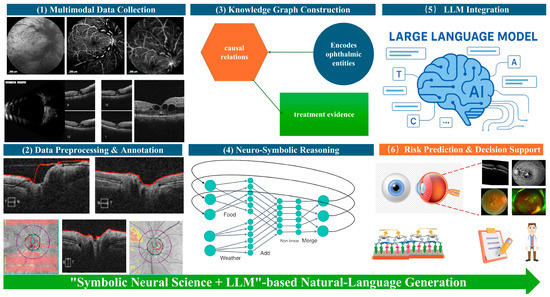 Figure 3 illustrates the sequential architecture and information flow of the proposed framework. Multimodal data collection forms the input layer, integrating structured textual records, ophthalmic imaging modalities, and continuous data streams from Internet-of-Things (IoT) biosensors to capture both clinical and lifestyle determinants of AMD. The data preprocessing and annotation stage standardizes and enriches these heterogeneous inputs through XML/JSON conversion, DICOM integrity checks, lesion segmentation, and concept tagging, thereby producing analysis-ready datasets. In the knowledge graph construction module, ophthalmic entities, causal relations, and treatment mechanisms are formalized as a domain-specific graph that encodes mechanistic understanding of AMD pathogenesis and therapeutic interventions.