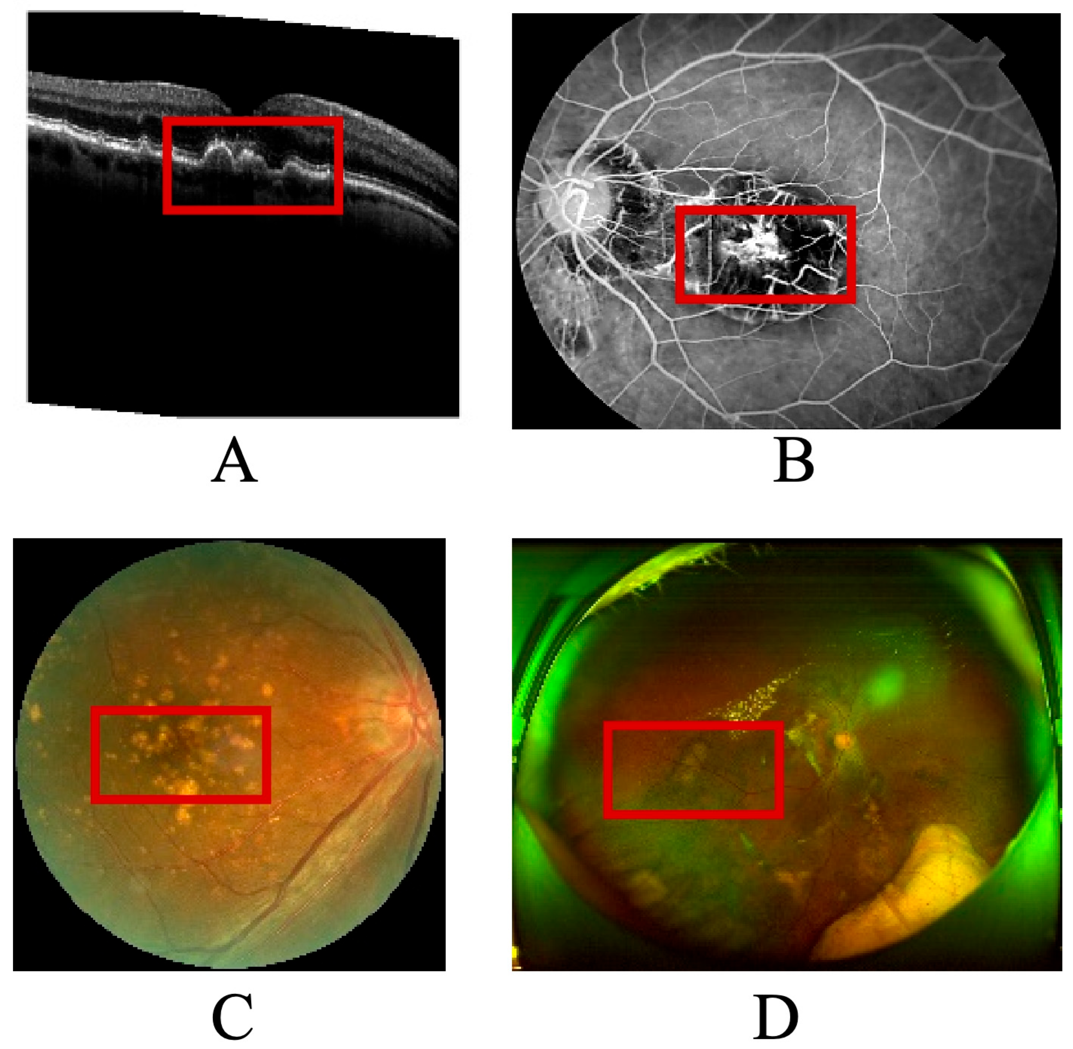 Figure 1, the multimodal imaging data reveal the spatial distribution and morphological variability of biomarkers used in the explainable prognosis framework for age-related macular degeneration (AMD). Each subpanel represents a distinct imaging modality—(A) optical coherence tomography (OCT), (B) color fundus photography, (C) fundus fluorescein angiography (FFA), and (D) wide-angle fundus imaging via scanning laser ophthalmoscopy (SLO). The red boxes in the figure mark the primary biomarker regions automatically detected by the algorithm and verified by clinical experts.