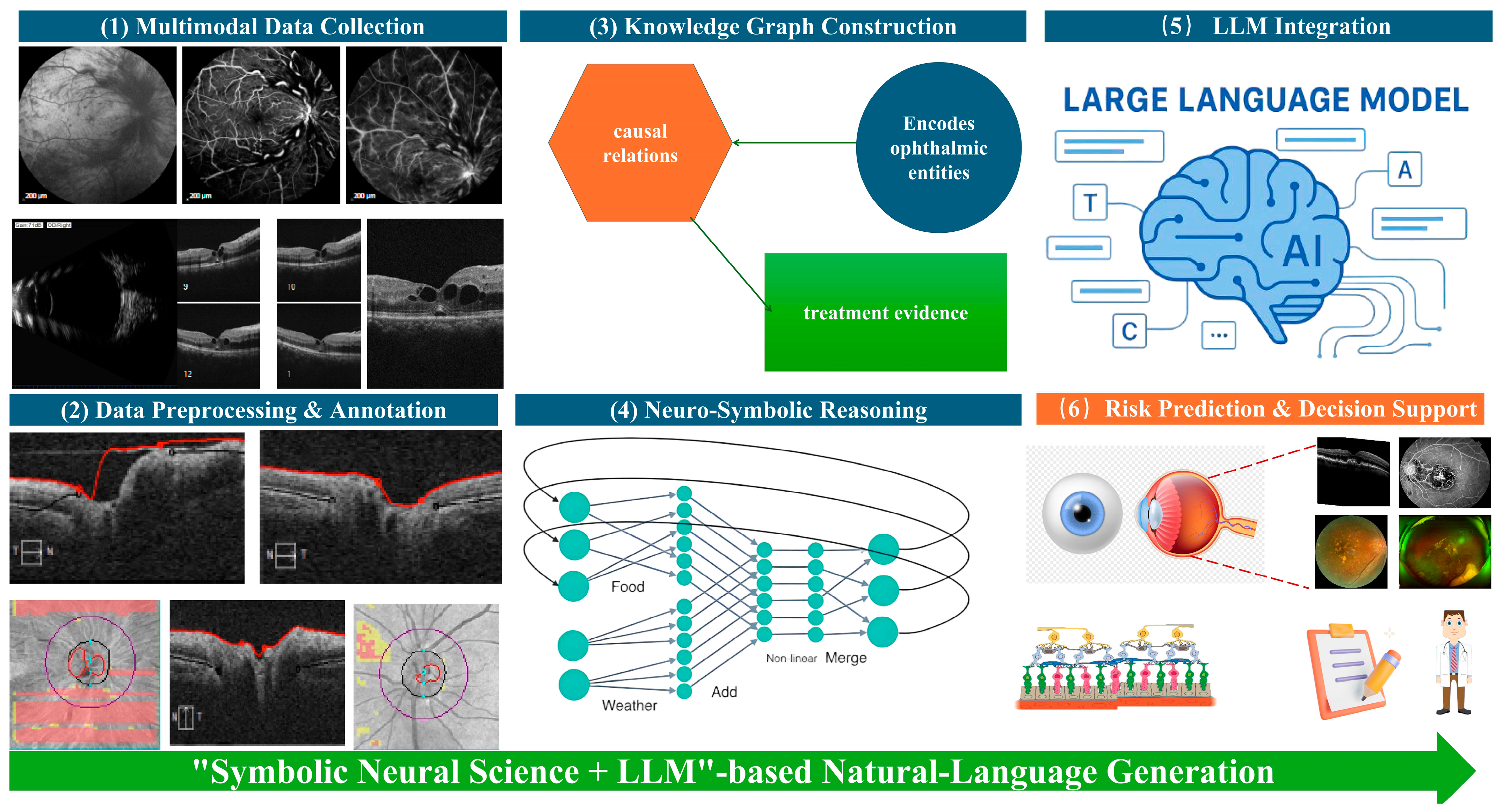 The neuro-symbolic reasoning layer overlays logical rules and graph-based constraints onto deep neural feature representations, enabling causal inference and biologically grounded risk modeling. These symbolic outputs, together with structured imaging metrics and textual entities, are then passed to the LLM integration layer, where multimodal clinical-profile prompts allow the language model to combine structured and unstructured evidence and to generate transparent, natural-language explanations of disease trajectory and treatment implications. Finally, the risk prediction and decision-support module synthesizes all upstream analyses to provide accurate AMD prognosis, individualized treatment guidance, and clinician-readable justifications. Collectively, this figure highlights how neuro-symbolic knowledge representation and LLM-driven semantic reasoning are fused into a single, reproducible pipeline for explainable AMD treatment prognosis.