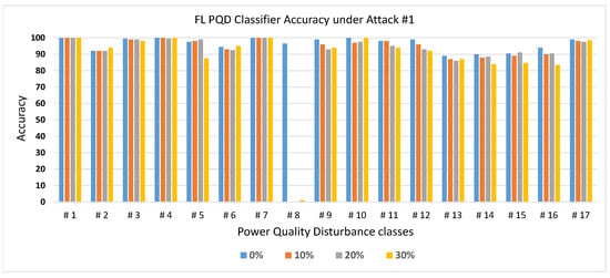 The FL PQD classifier accuracy under Attack #1 using the Median Defense.