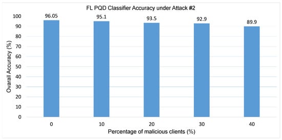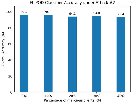 The FL PQD classifier accuracy under Attack #2 using the Median Defense.