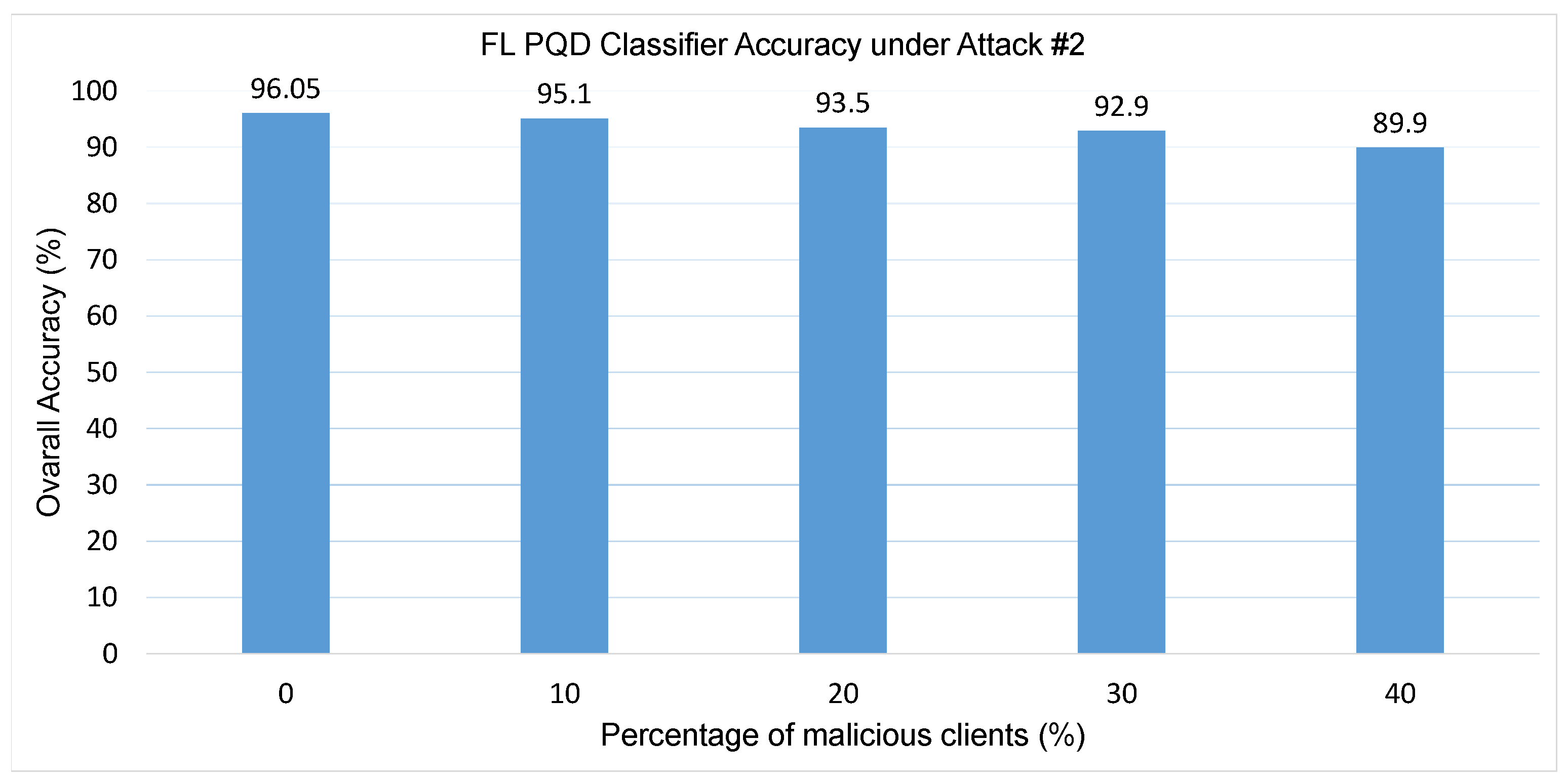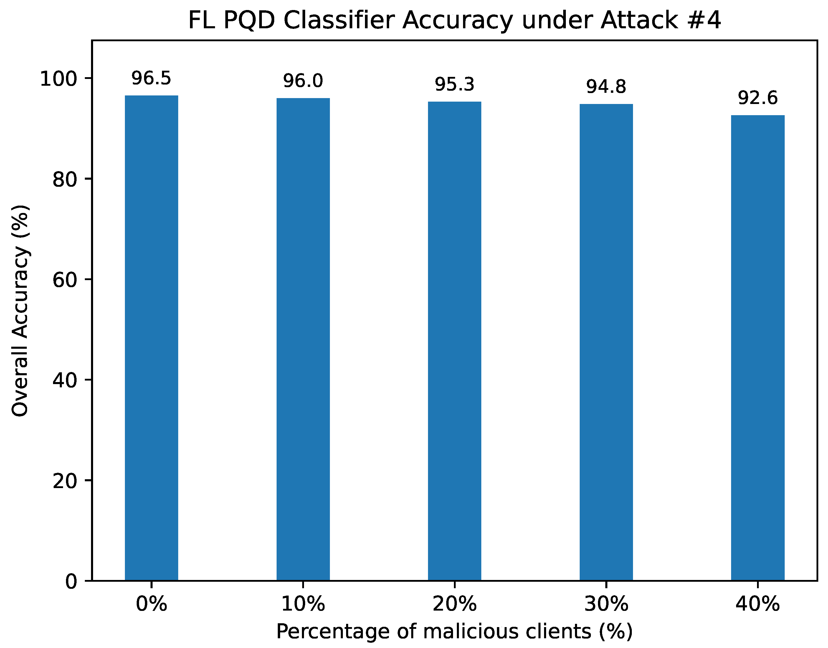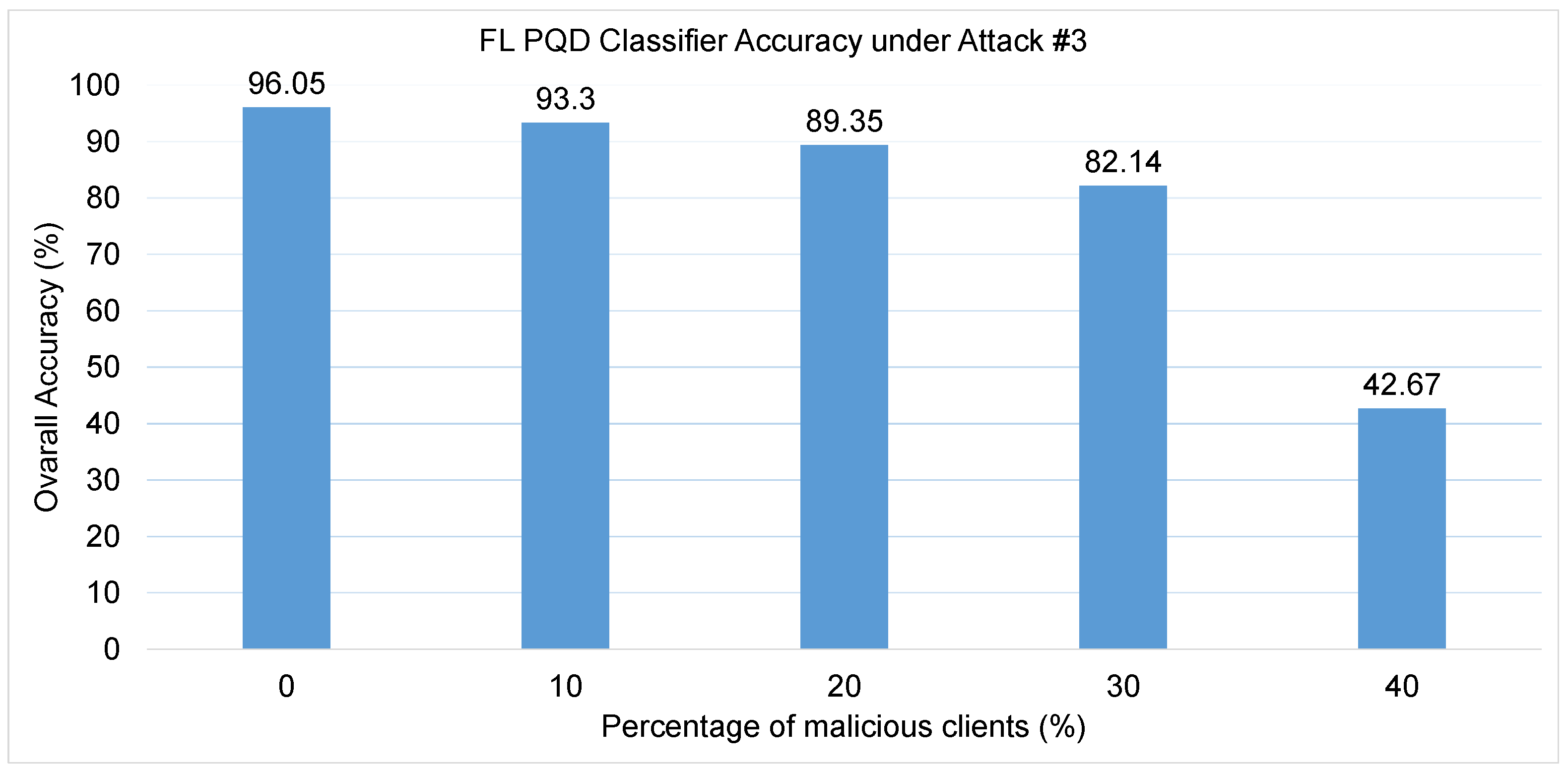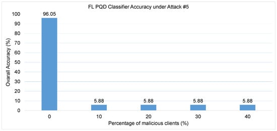 A similar stabilizing effect is observed across precision, F1-score, and false alarm rate, where the defense curtails the sharp degradation evident in the undefended setting. Overall classification accuracy is likewise preserved, decreasing from 96.4% with no attackers to 89.09% at 40% adversarial participation. By comparison, the unprotected model suffers a dramatic breakdown, as shown in Figure 10, where accuracy plunges from 96% to only 5.88% with the involvement of a single malicious client.