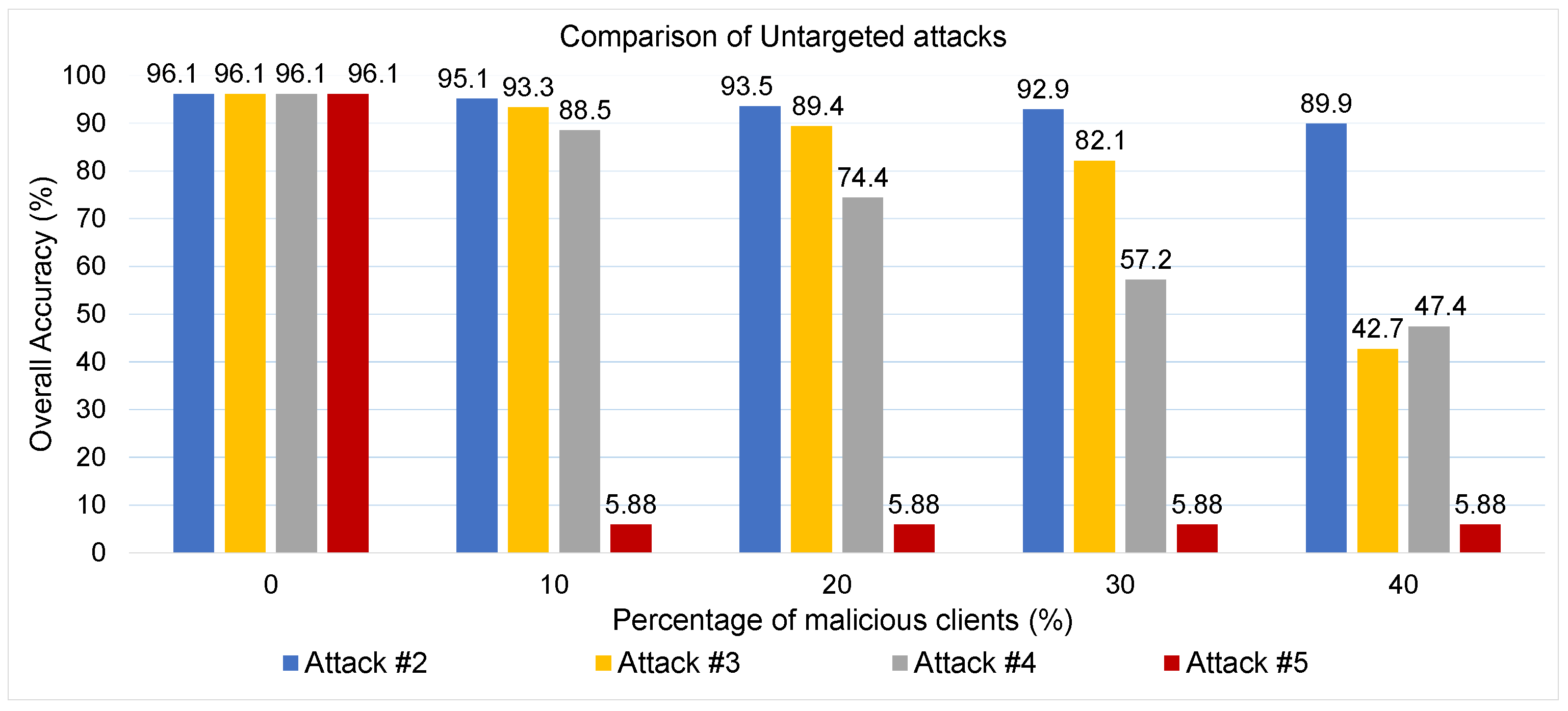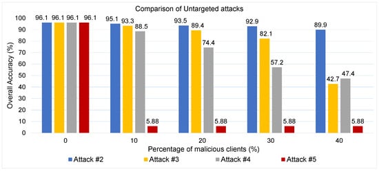Finally, Attack #5, which used the model replacement technique, proved the most effective among untargeted attacks—especially in scenarios with only a few adversaries. Unlike the other attacks, this strategy allows even a single malicious client to override the global model update, making it significantly more potent when attackers are few.