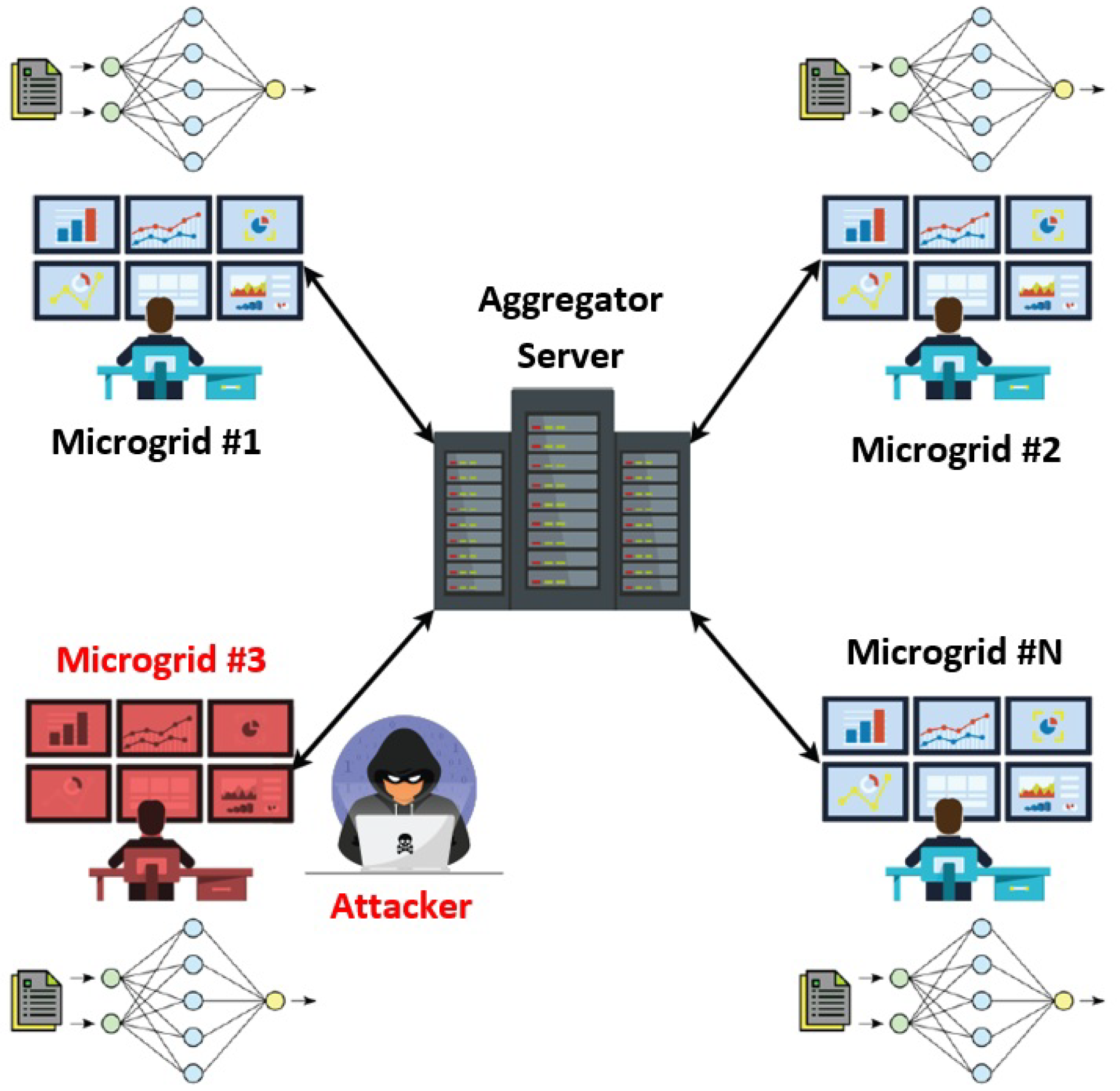 The success of the FL training process relies on stable and secure communication between the central server and the participating entities. While external threats—such as eavesdropping or data tampering during transmission—pose risks, this work assumes that such threats are mitigated through standard cryptographic techniques. Specifically, we assume the use of established encryption methods, including both symmetric and asymmetric key protocols, to protect data confidentiality and integrity during communication. Therefore, external adversaries are beyond the scope of this study. Instead, we focus on a more subtle and challenging category of threat: internal adversaries, particularly malicious microgrid managers involved in the FL process.