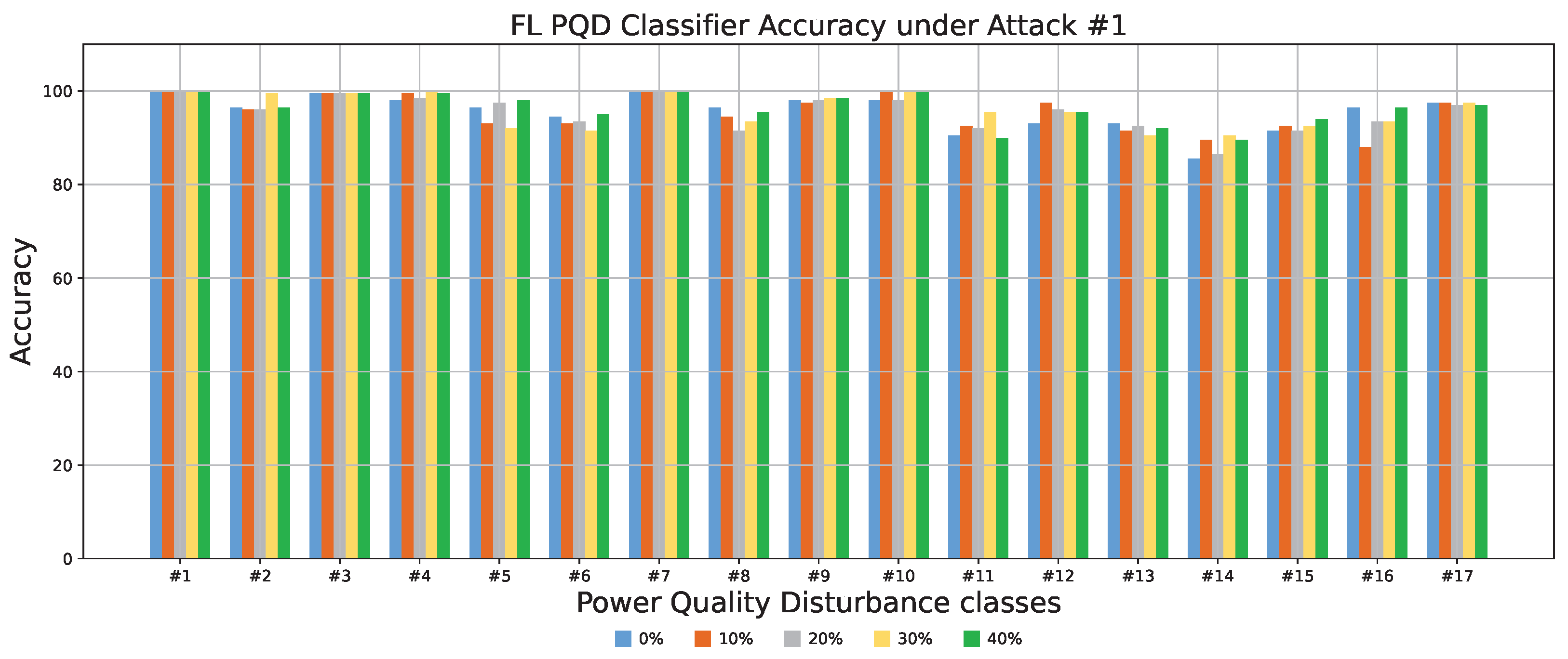 Attack #1. Figure 12 shows the classification accuracy of the FL-based PQD model when protected by our defense. Compared with Figure 6, which depicts performance without any defense, the proposed method demonstrates a substantial improvement in robustness. Notably, the accuracy for class #8 increases from nearly 0% in the undefended case to about 93% when the proportion of malicious clients is between 10% and 40%. This gain is a direct result of the median aggregation mechanism used by our defense, which effectively emphasizes benign gradients while suppressing adversarial updates during global model training.