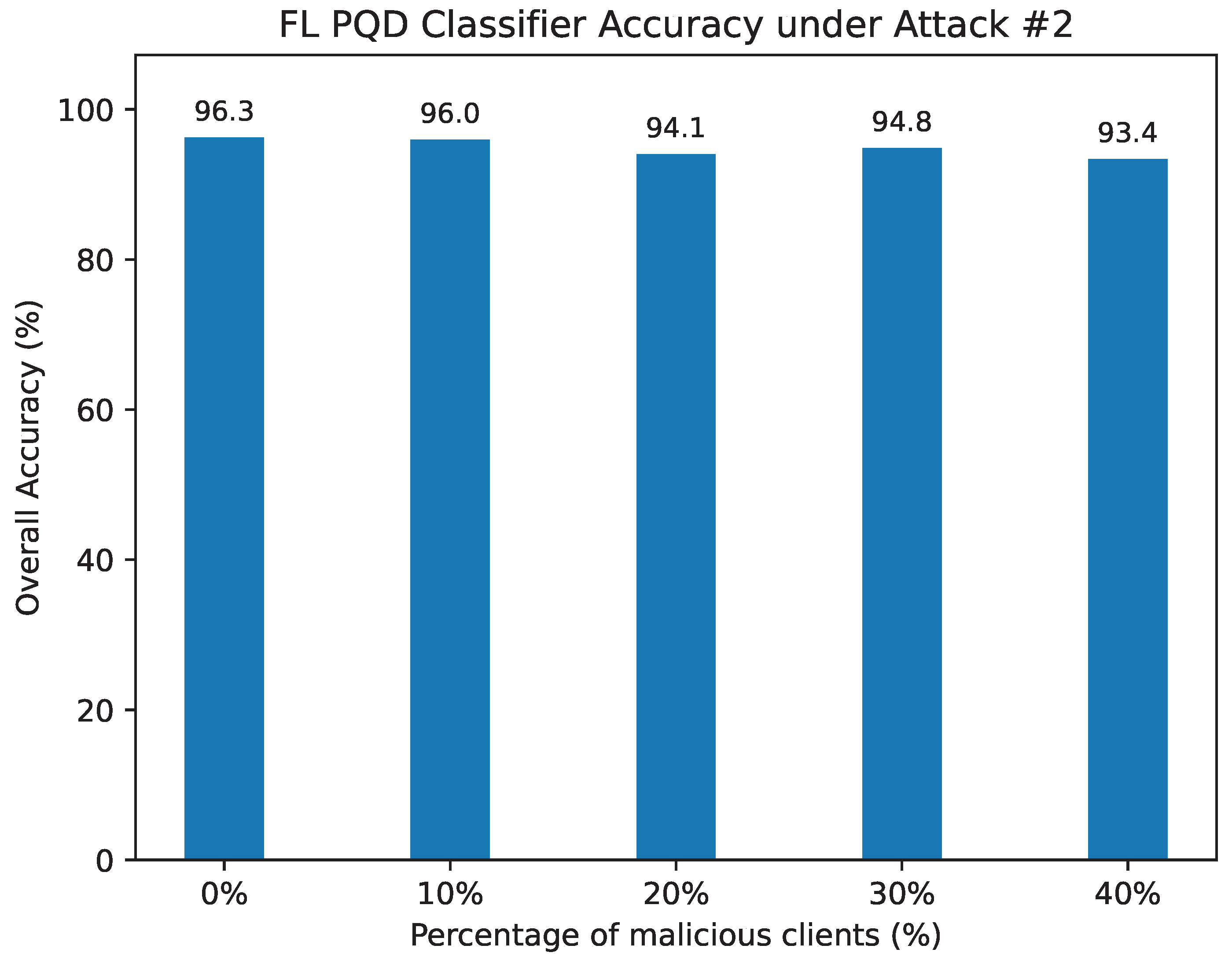 Attack #5. Table 10 and Figure 16 present the performance of the FL PQD classifier under Attack #5 when protected by our defense. The HD metric remains robust, showing only a modest reduction from 92.5% in the benign case to 84.19% with 40% malicious clients. In contrast, without defense (Table 6), HD collapses immediately, reaching 0% as soon as adversarial updates are introduced.