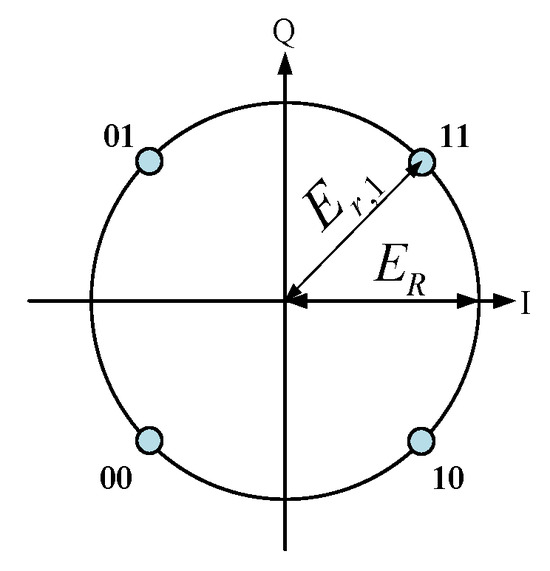 - Rotate as a whole to let the phase of be equal to . (This compensation is necessary because electromagnetic wave propagation induces constellation rotation in practical systems. But, by using the difference QPSK [26], the information is only decided by the relativity location of received fields in the constellation. Thus, four states of fields can be rotated to match the reference constellation in Figure 5a.)