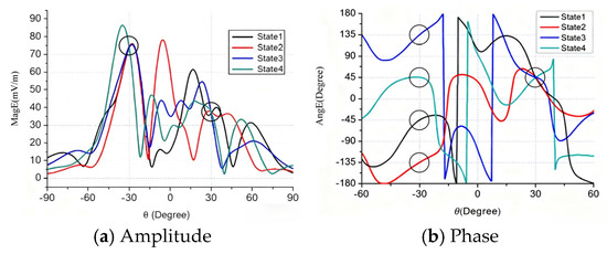 For any fixed m satisfying , there exist four phase-shift configurations within the total 16 sets that simultaneously satisfy for , and vice versa. This implies that, when transmitting a signal in one direction with the required radiation field (where m can be any valve between 1 to 4), an appropriate phase-shift configuration can be selected from four sets to achieve the target field (where n can be any value between 1 to 4) in another direction. Thus, the two-directional simultaneous transmissions by one phased array can be realized. This technique can be easily extended to MIT.
