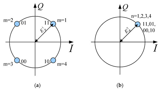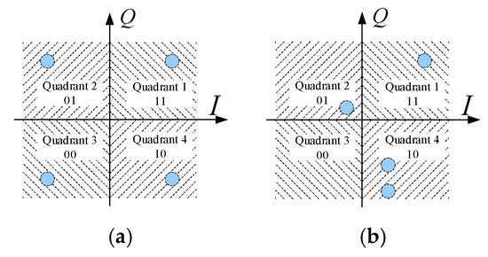 As a result, the noise-corrupted received field points deviate significantly from the four ideal points, denoted as , in the I/Q plane. The Maxim Likelihood Method [26] is commonly used for information recovery: the distances from to the four points of are calculated, and the closest ideal point is selected as the decoded symbol. An equivalent approach partitions the I/Q plane into four decision regions (Figure 6a), each corresponding to a unique two-bit signal. The received signal is recovered by determining which region falls into. In some cases, the distinction between and is very large, resulting in a scrambled location for in the constellation, as shown in Figure 6b.