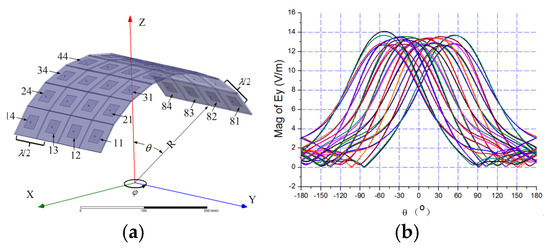 The 8 × 4 patches are arranged in a cylinder surface as shown in Figure 9a. Four elements are arranged in the y direction and eight elements are arranged in the x direction. The size of each patch is 22.45 mm × 22.45 mm, and the substrate has a dielectric constant of 4.4 with a thickness of 2 mm. All patches work in line polarization (in the direction of y) at 3 GHz. The spacing between antenna elements is . The radius of cylinder R is 190 mm.