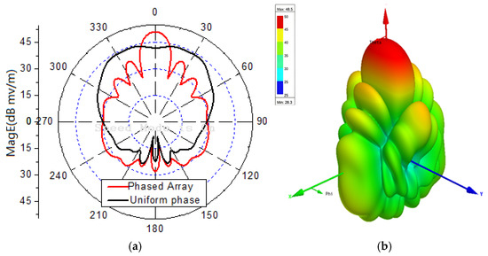 Figure 10a compares the radiation patterns with zero-phase excitation (black line) and phase-shifted excitation (red line) to steer the main lobe to . The red line confirms that the main lobe is successfully steered to the desired direction. Figure 10b shows the 3D radiation pattern for the phase-shifted excitation.