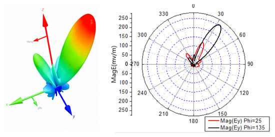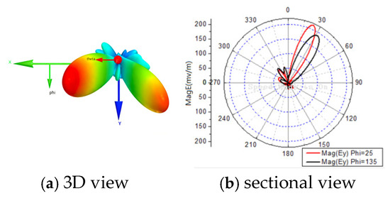 The full-wave electromagnetic simulation software Ansys Electronics Desktop2022 is employed to analyze the radiation character of the array. Figure 9b is the far-field radiation pattern of all elements in the xoz plane.