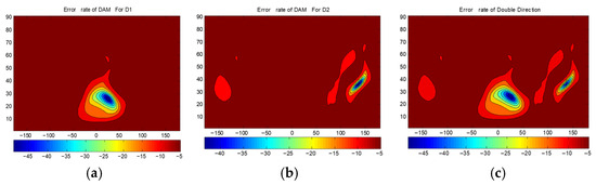 The BERs(dB) of DAM: (a) for the information of Direction 1; (b) for the information of Direction 2; and (c) the combined results.