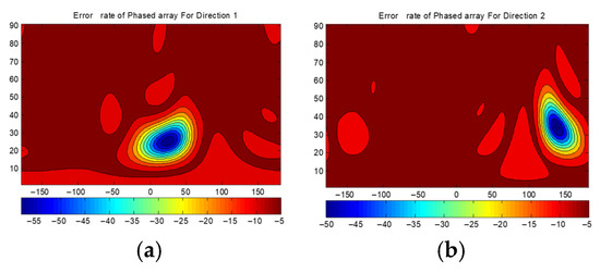 Now, let us focus on another question: how to calculate the BER for MIT. Consider two-direction communication as an example: 16 sets of phase shifts, denoted as (i = 1~N, with N being the number of elements, m = 1~4, and n = 1~4), should be prepared. The fields of the array using phase shifts of should satisfy Formula (17) in the two directions of .