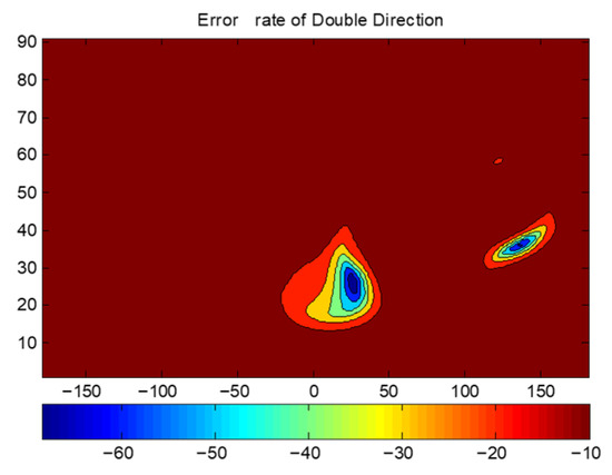 Figure 12 presents the BER distributions for the two-directional DAM system. Figure 12a is Direction 1 with . Figure 12b is Direction 2 with . Figure 12c shows the combined BER. Figure 13 shows the BER of a traditional phased array steering its beam to Direction 1 and Direction 2. Figure 14 presents the BER sectional view for both system in the xoz planes of and .