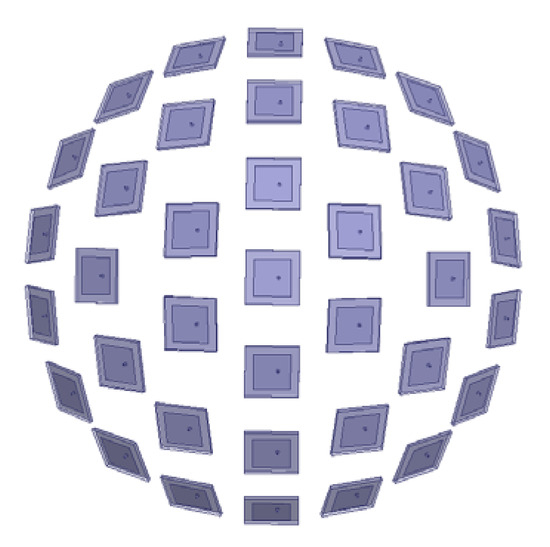 To validate this, a spherical conformal array with 37 elements shown in Figure 18 is tested. The radius of the sphere is 156.7 mm. The distance between the cells is 57.31 mm, greater than the half-wavelength of 3 GHz. The two transmission directions are taken as . Figure 19 presents the BER distribution of the sparse array, showing no significant grating lobes—confirming that DAM systems can overcome the half-wavelength spacing limitation. This enables the design of compact, low-cost sparse arrays for MIT applications.