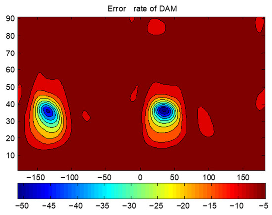 In traditional transmission, I/Q modulation is performed prior to the phase delaying. Therefore, even if the amplitude of becomes very small in other directions, the order and the angular separation between the four points of in the constellation remain unchanged with direction. Formulae (5)–(7) are only applicable in such a scenario. In contrast, for DAM, the order and the angular separation between the four points of in the constellation change significantly with direction, as previously mentioned.