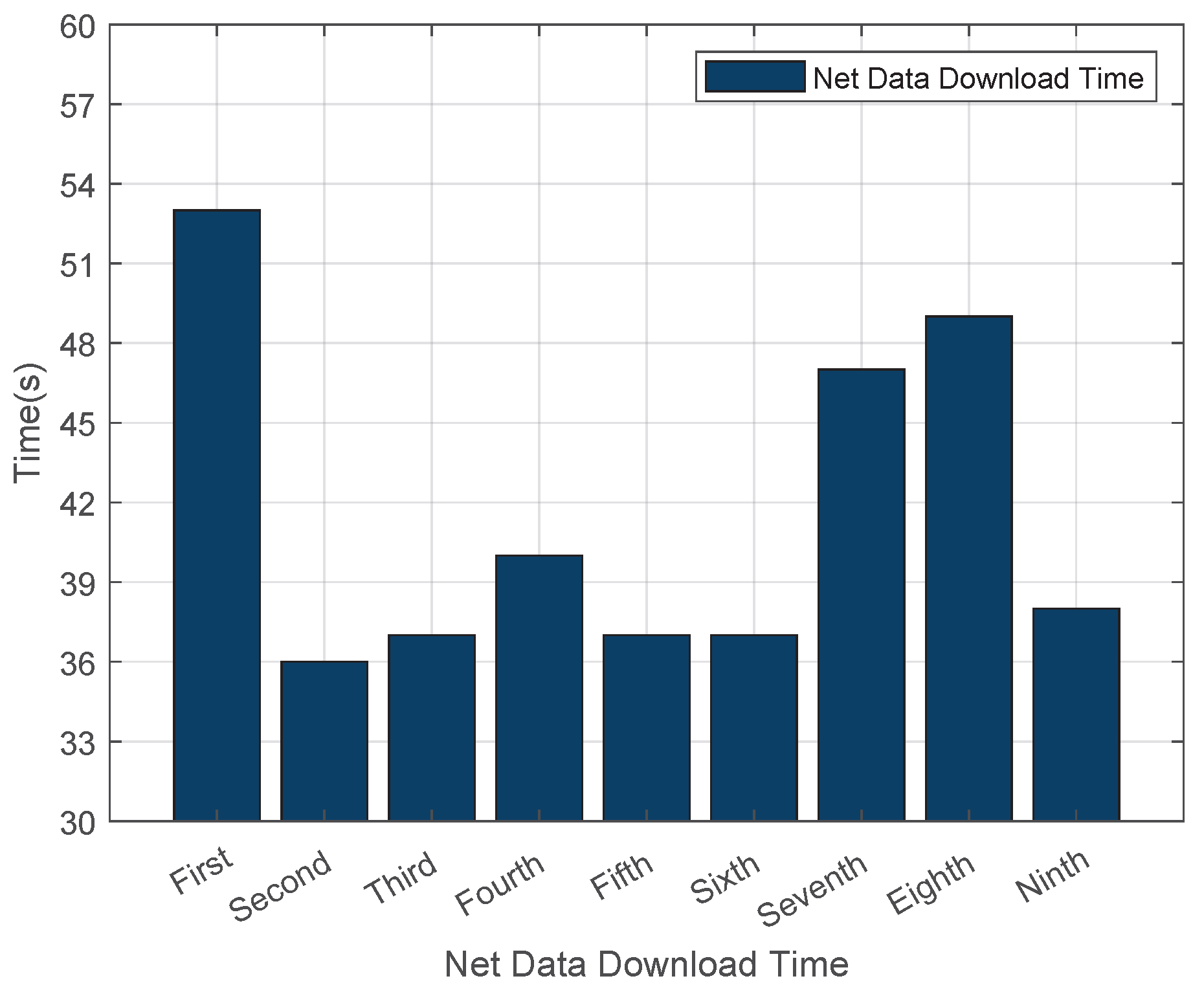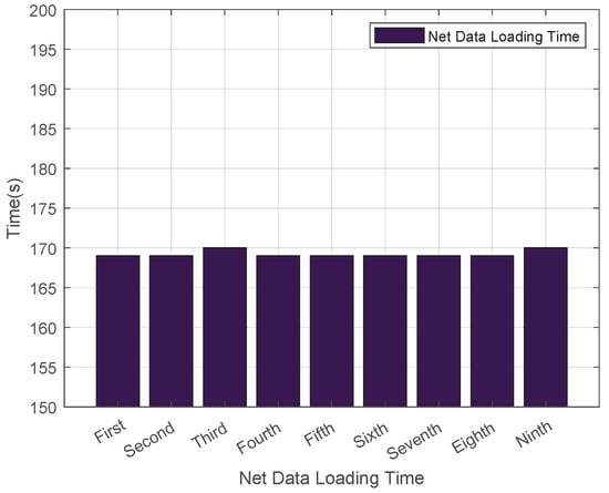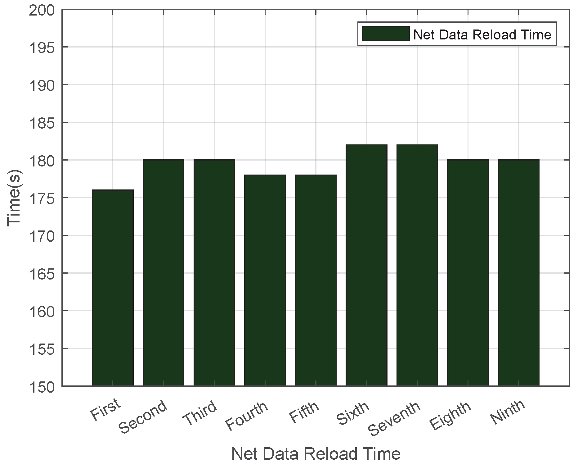 As illustrated in Figure 4, the average download time for .net domain data was recorded at 42 s. The fluctuation in download time is caused by changes in the network environment. This setup aligns with the actual scenario of DNS zone file updates in real networks, and the fluctuating data can more truly reflect the download speed of the system in a normal network. We conducted multiple experiments, and the results showed high stability. Figure 5 showcases the outcomes of multiple load tests on .net top-level domain files using Bind9, which revealed that the average cold data loading duration for the .net domain reached 170 s. Additionally, Figure 6 demonstrates that the average reload time for .net zone files amounted to 180 s. Such consistent results across multiple experiments indicate that our experimental data is highly stable.