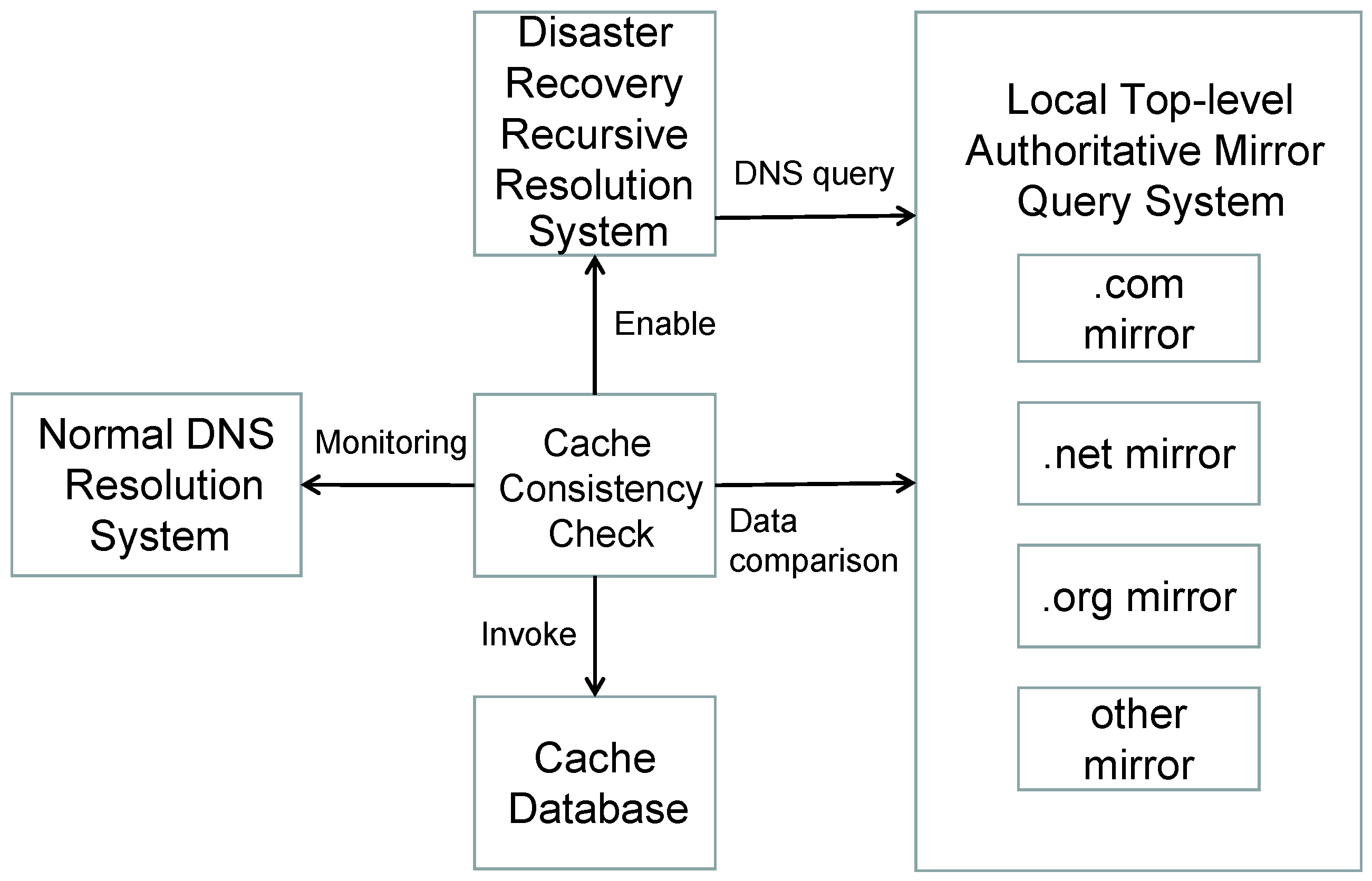 In this study, we employ the DNS-Sensor system to prevent cache poisoning attacks. However, the DNS-Sensor system faces a significant performance bottleneck, requiring frequent comparisons between local cache resolution records and records obtained through authoritative queries. The query for authoritative resolution records is a time-consuming process [,]. To enhance the efficiency of the DNS-Sensor system and concurrently initiate a disaster recovery recursive resolution system, we implement a local top-level authoritative mirror query system to accelerate the comparison speed. The disaster recovery resolution system provides effective measures in response to detected DNS cache poisoning. This system comprises two main components, namely, the Emergency Cache Query System and the Local Top-Level Authoritative Mirror Query System, ensuring secure and reliable DNS resolution services (Figure 3).