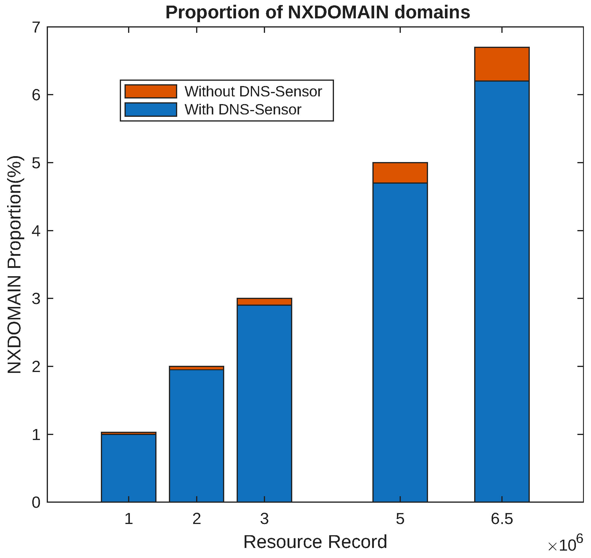 Experimental findings indicated that the DNS-Sensor system exhibits high levels of flexibility and scalability. It can select diverse comparison methods and data storage strategies according to actual scenarios, with corresponding adjustments made to the alert mechanism. Comparison with Other Methods: A comparative analysis was carried out between the DNS-Sensor system and other commonly used DNS cache poisoning defense methods. As shown in Figure 7, when the number of resolution records in the cache increases, on the one hand, the proportion of NXDOMAIN domains increases both with and without the DNS-Sensor. When using the DNS-Sensor, we can clearly observe that the proportion of NXDOMAIN domains is less than that without using the DNS-Sensor. Meanwhile, as the number of resolution records in the cache increases, the effect of the DNS-Sensor becomes more obvious, and the reduction in the proportion of NXDOMAIN domains brought by using the DNS-Sensor is more significant. As presented in Table 2, experimental data verified that the DNS-Sensor system not only surpasses other methods in defending against fragment rearrangement attacks but also maintains a certain edge in overall performance metrics.