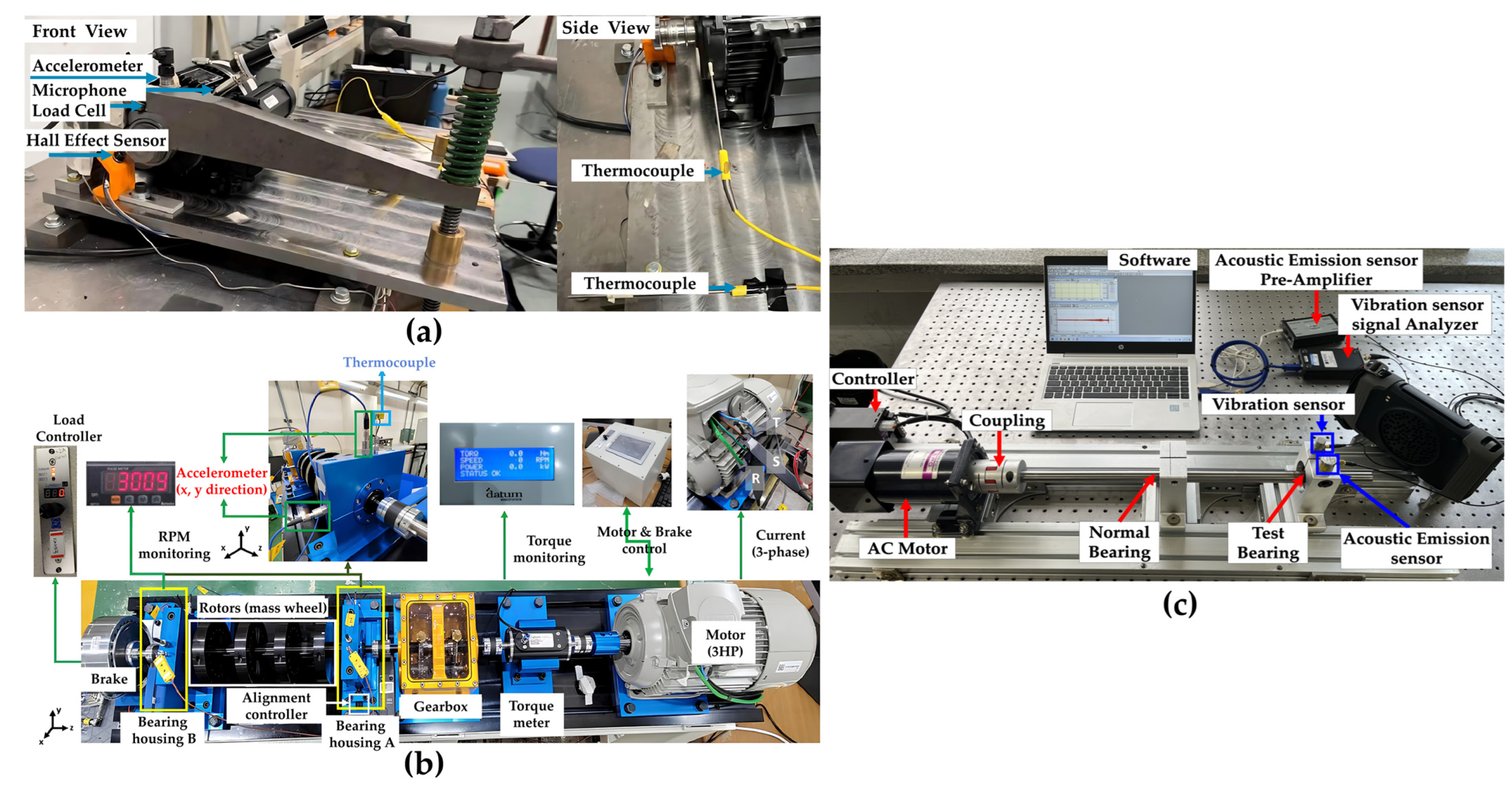 - Jung, W.; Kim, S.-H.; Yun, S.-H.; Bae, J.; Park, Y.-H. Vibration, acoustic, temperature, and motor current dataset of rotating machine under varying operating conditions for fault diagnosis. Data Brief 2023, 48, 109049. [Google Scholar] [CrossRef]
