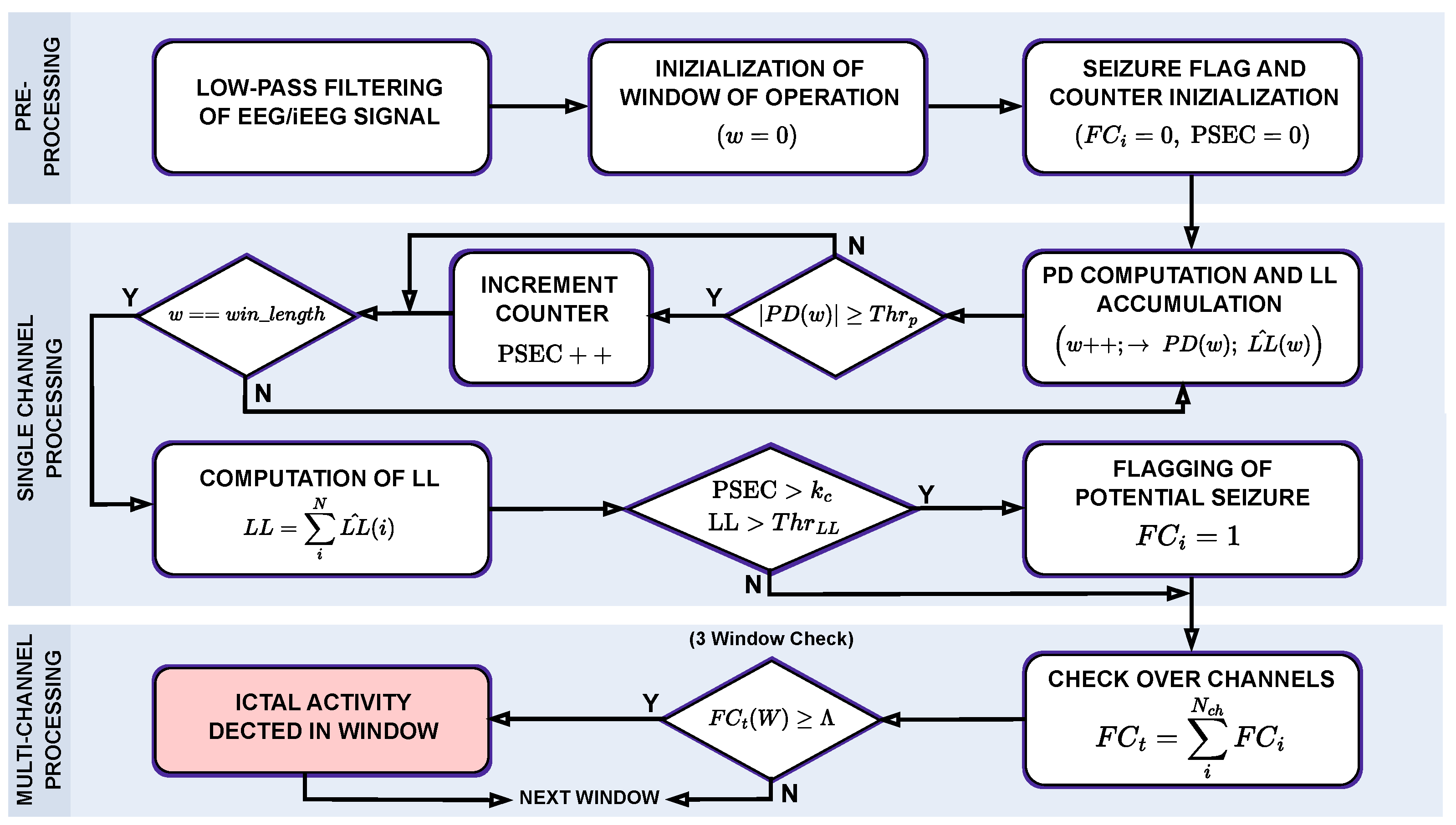 For simulations of the algorithm conducted on the CHB dataset, as well as the intracranial SWEC-ETHZ datasets, a duration of 1 s was established for the processing windows, corresponding to samples. This configuration was identified as optimal after evaluating multiple window sizes and observing superior overall detection performance and consistency across datasets.