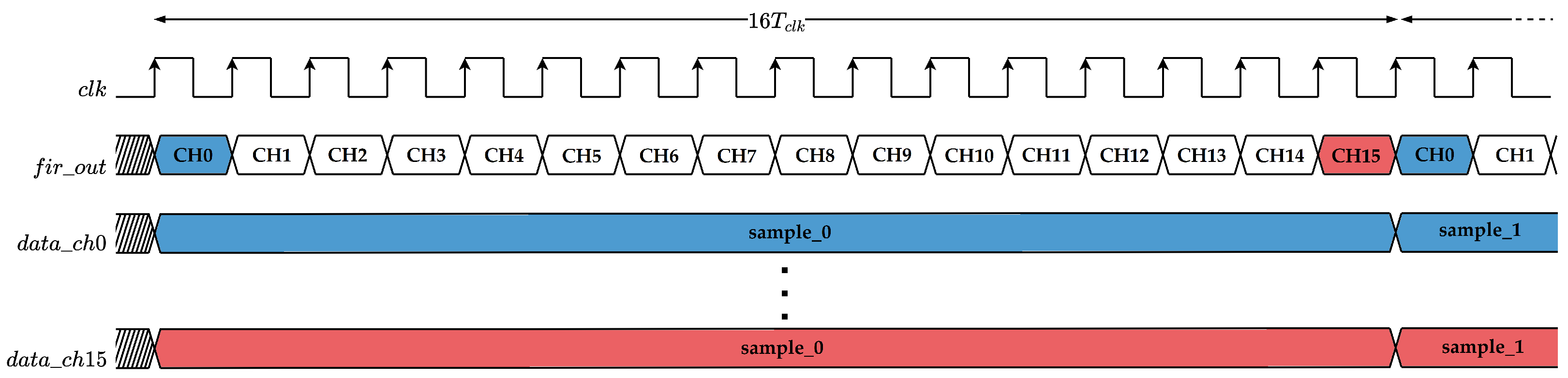i-th sample of each channel across all coefficients before the next input sample arrives. The high-level functional timing diagram of the FIR’s operation is shown in