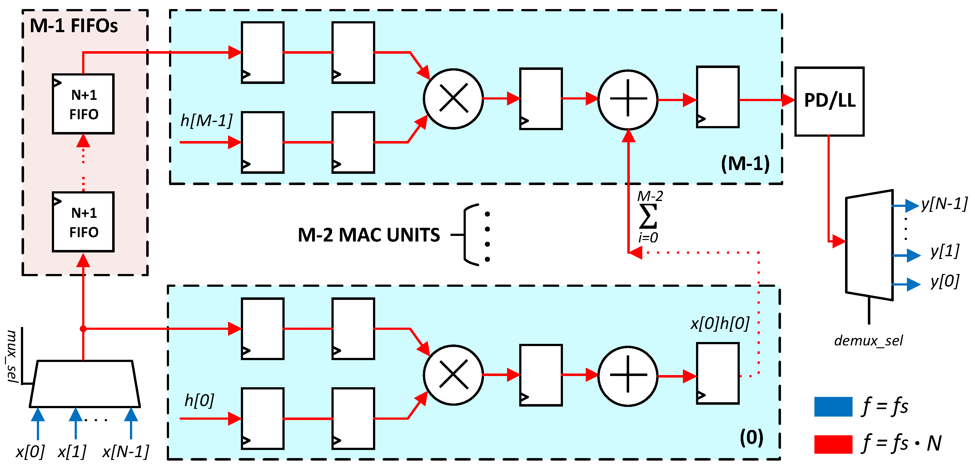 Figure 5). In this architecture, data flows through an array of interconnected processing elements, each performing a partial multiplication and accumulation. This pipelined organization improves resource utilization, allowing the filter to sustain real-time operation across multiple channels while maintaining scalability and predictable timing behavior. For data alignment purposes, a series of First-In First-Out (FIFO) elements is used to ensure proper TDM operation, while dedicated registers are inserted in the processing chain to break critical paths.