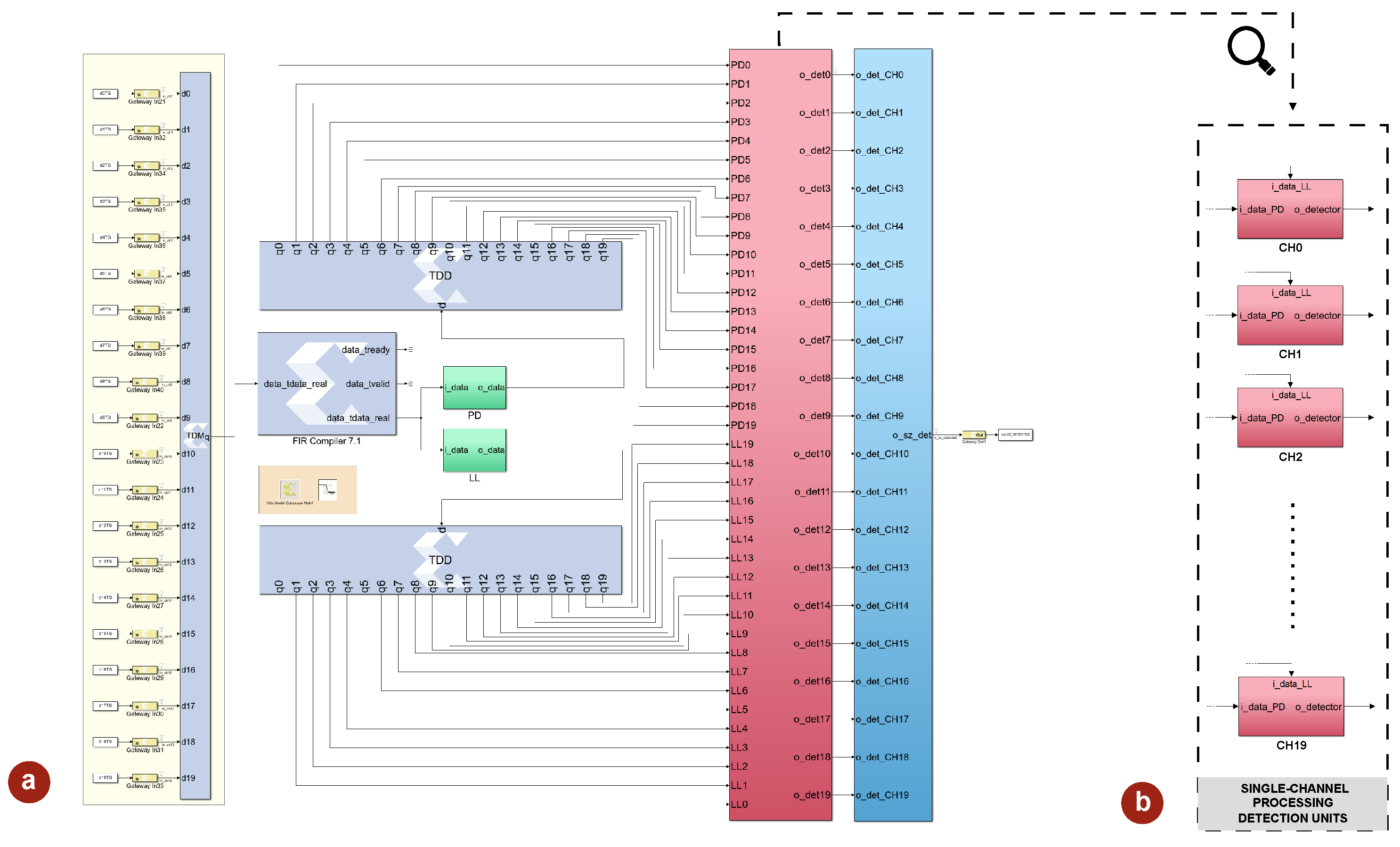 Figure 7a is the model of the hardware architecture implementing a 20-channel version of the proposed algorithm, emphasizing the scalability of the system. The choice of twenty channels was deemed sufficient to meaningfully exploit the multi-channel voting mechanism, while still maintaining a realistic hardware configuration. As shown at the top of the figure, the 20 EEG inputs logged from the MATLAB environment are collected and passed through a dedicated time-multiplexing block, which combines them into a single interleaved stream. This stream, operating at the frequency specified in Equation (