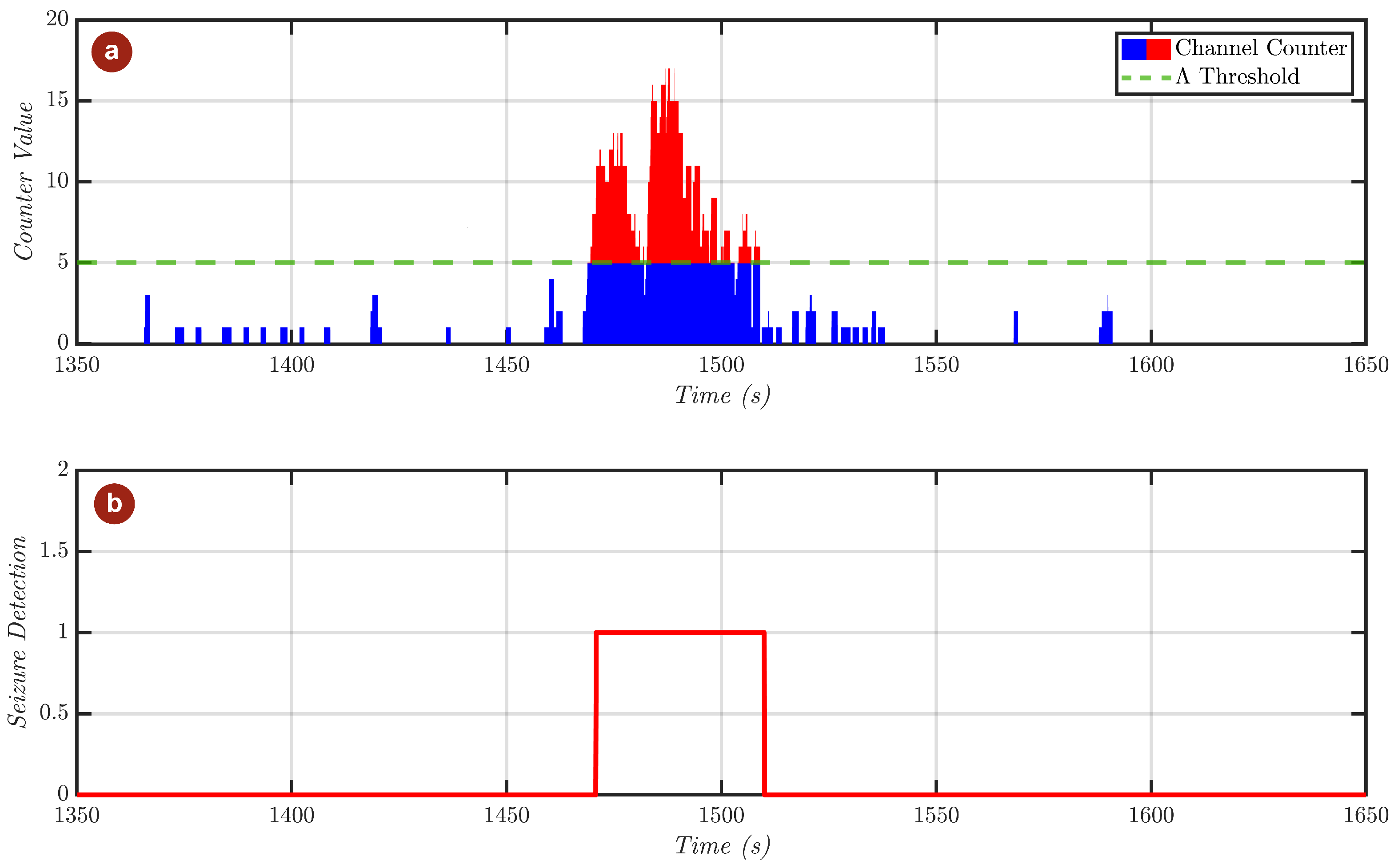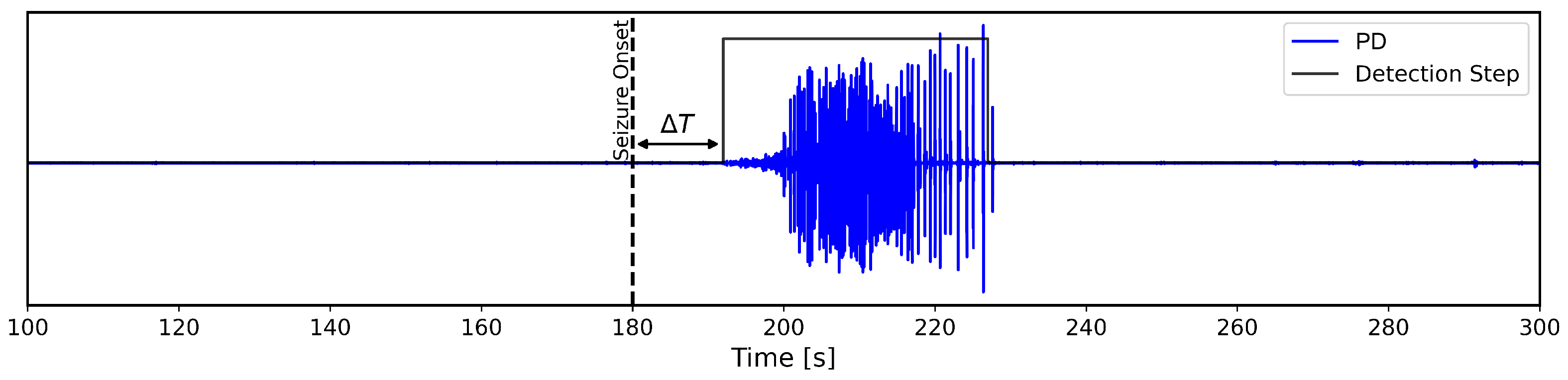 Figure 11 shows a practical example of the delay described above, illustrating how the inherent properties of the threshold-based algorithm can cause its identification of physiological changes in neural patterns to diverge from the annotated seizure onset due to uncertainty in the onset timing.