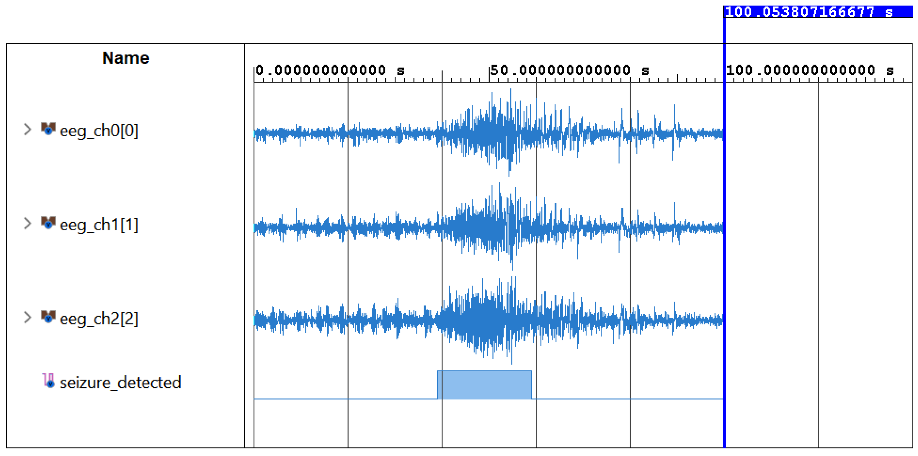 Figure 9 shows the result of the detection when fed with EEG data capturing a segment that includes the transition from non-ictal to ictal activity. For visual clarity, only three channels are present in the waveform window. In this case, it is evident that the system reacts rapidly to the presence of abnormal seizure-related patterns.