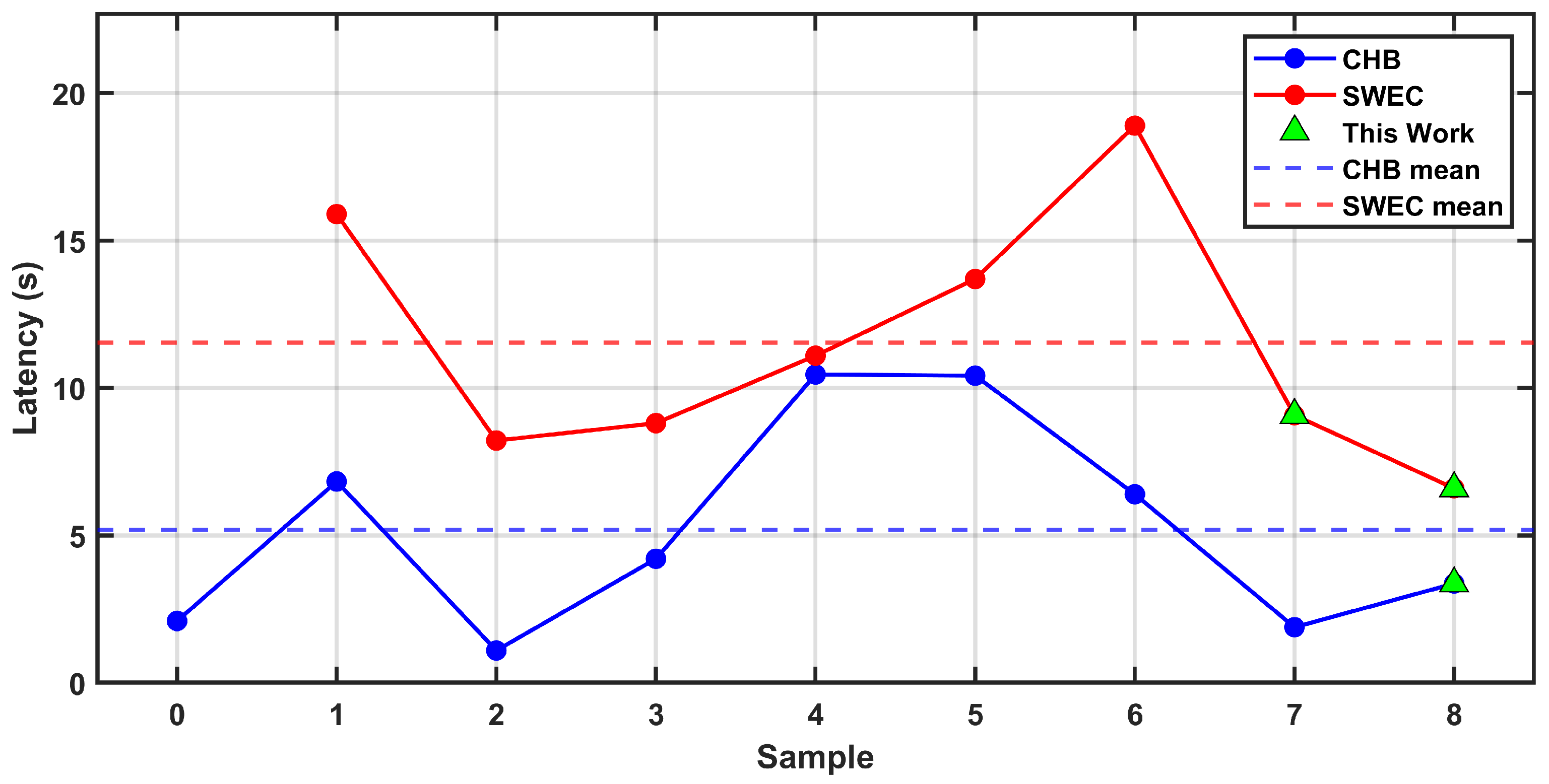 Figure 12, the latency values reported for various algorithms on the CHB and SWEC datasets reveal notable differences across datasets. For most state-of-the-art methods, latencies increase when tested on the iEEG SWEC dataset compared to CHB, suggesting potential inconsistencies in the annotations or differences in the characteristics of the SWEC recordings. The points corresponding to the proposed approach demonstrate competitive performance on both datasets, achieving low latency comparable to other methods on CHB while maintaining robust performance on SWEC, with results on the long-term SWEC dataset among the best reported. These results suggest that the method generalizes effectively across datasets and further emphasize the importance of cross-dataset validation to account for possible differences in annotation protocols and signal characteristics.