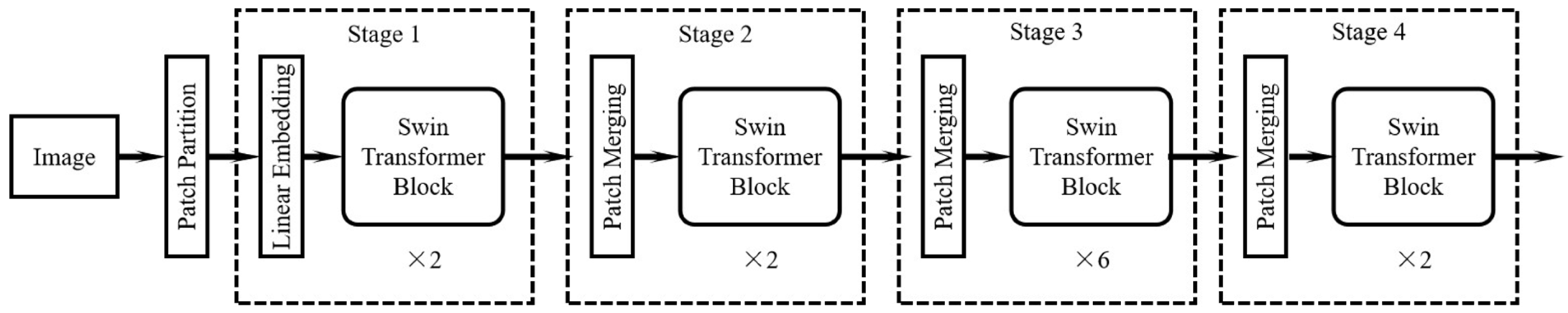 W for width), the image was first divided into several 4 × 4-pixel patches. Subsequently, these image patches underwent a linear embedding operation, which projects the features of each patch into a high-dimensional space and expands them along the channel direction. At this point, the image size is