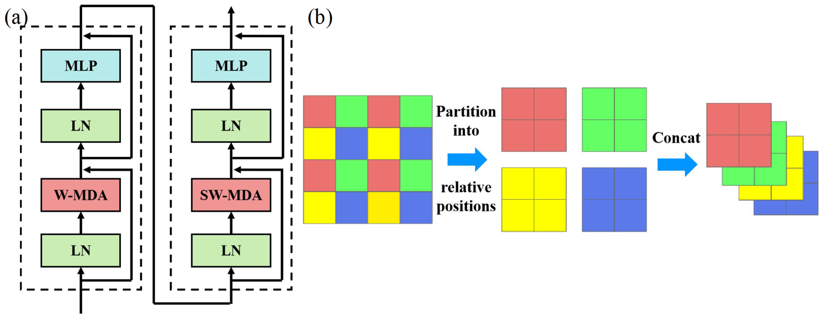 Figure 2a shows the Swin Transformer unit structure. It is largely consistent with the original transformer unit structure; however, the primary distinction lies in the multi-head attention mechanism, which is replaced by window-based multi-head deformable attention (W-MDA) and shifted window-based multi-head deformable attention (SW-MDA). Furthermore, the Multi-Layer Perceptron, which serves as the feed-forward network, comprises two layers, interspersed with a GELU activation function. Notably, Swin Transformer units are utilized in pairs. In this pairing, the attention mechanism within the first unit is based on fixed-window multi-head attention, while the second unit employs a shifted-window multi-head attention. Additionally, the patch merging operation is functionally similar to pooling, aiming to reduce image resolution for downsampling. However, unlike traditional pooling, the mechanism of patch merging involves combining feature values from the same relative positions within a window to form new feature patches and subsequently concatenating these new patches.