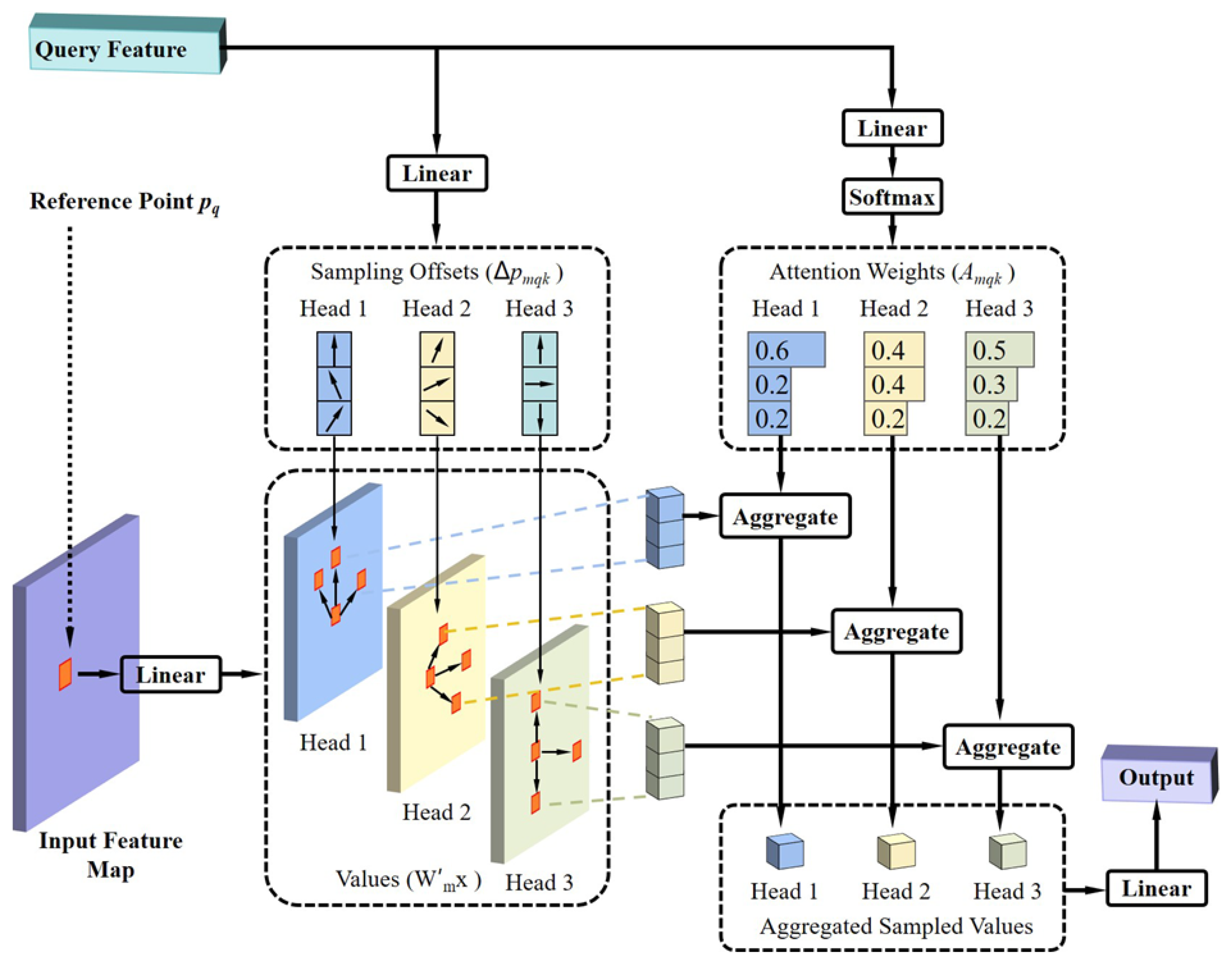 Figure 4, allows each pixel to compute attention solely with a subset of sampled pixels, rather than interacting with every pixel in the entire image. Consequently, this mechanism substantially reduces the computational burden and accelerates the model’s convergence speed. Furthermore, deformable attention concurrently incorporates the principle of multi-scale features. Utilizing deformable attention on multi-scale feature maps can also improve small object detection accuracy, eliminating the need for Feature Pyramid Networks (FPNs) [