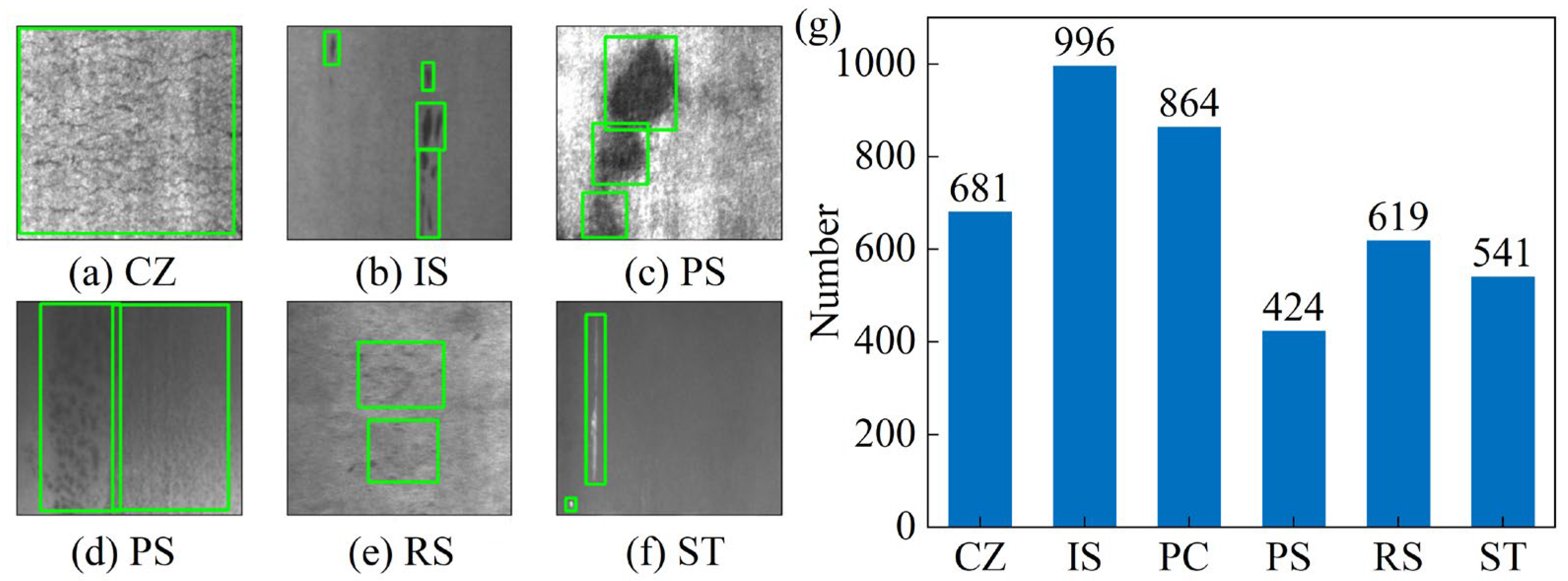 22], an open-source resource from Northeastern University. Specifically, this dataset includes 1800 grayscale images, uniformly sized at 200 × 200 pixels. Furthermore, it includes six common defect types present on hot-rolled steel surfaces, which are crazing (CZ), inclusion (IS), pitted surface (PS), patches (PC), scratches (ST), and rolled-in scale (RS). Individual defect images and their corresponding bounding boxes are illustrated in