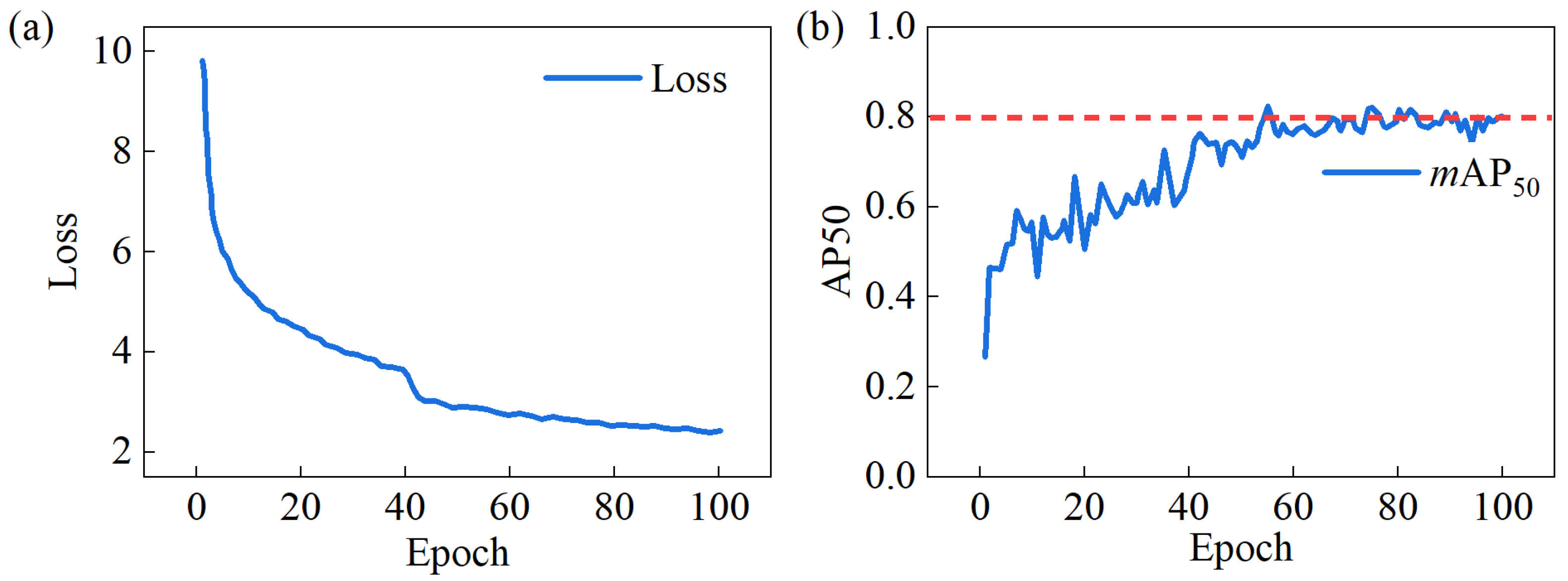 mAP50 curve exhibited a sharp increase. This phenomenon occurred because the training strategy adjusted the learning rate at the 40th epoch, reducing it tenfold from 0.0002 to 0.00002. After 100 iterations, the optimal