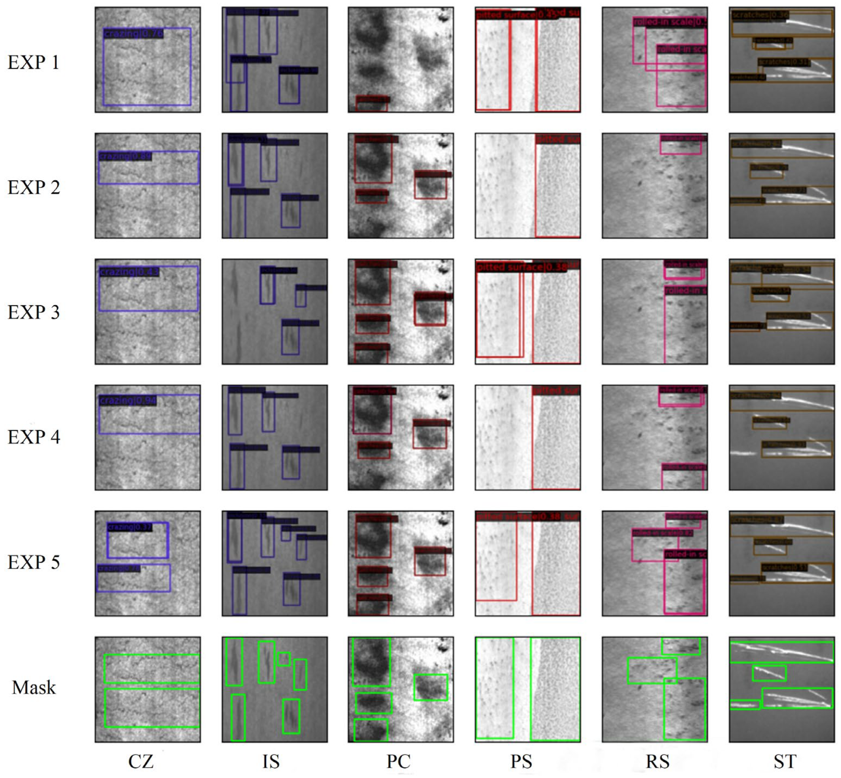 Figure 9 illustrates a visual comparison of the detection results for different defect types across various experimental groups. As can be seen from the figure, Experiment 5 demonstrated significant advantages in terms of localization accuracy and bounding box tightness in detecting defects. In particular, when detecting small-sized or irregularly shaped defects, Experiment 5 was able to generate more accurate prediction boxes and effectively reduced instances of missed detections and false positives. This is highly consistent with the quantitative results presented in