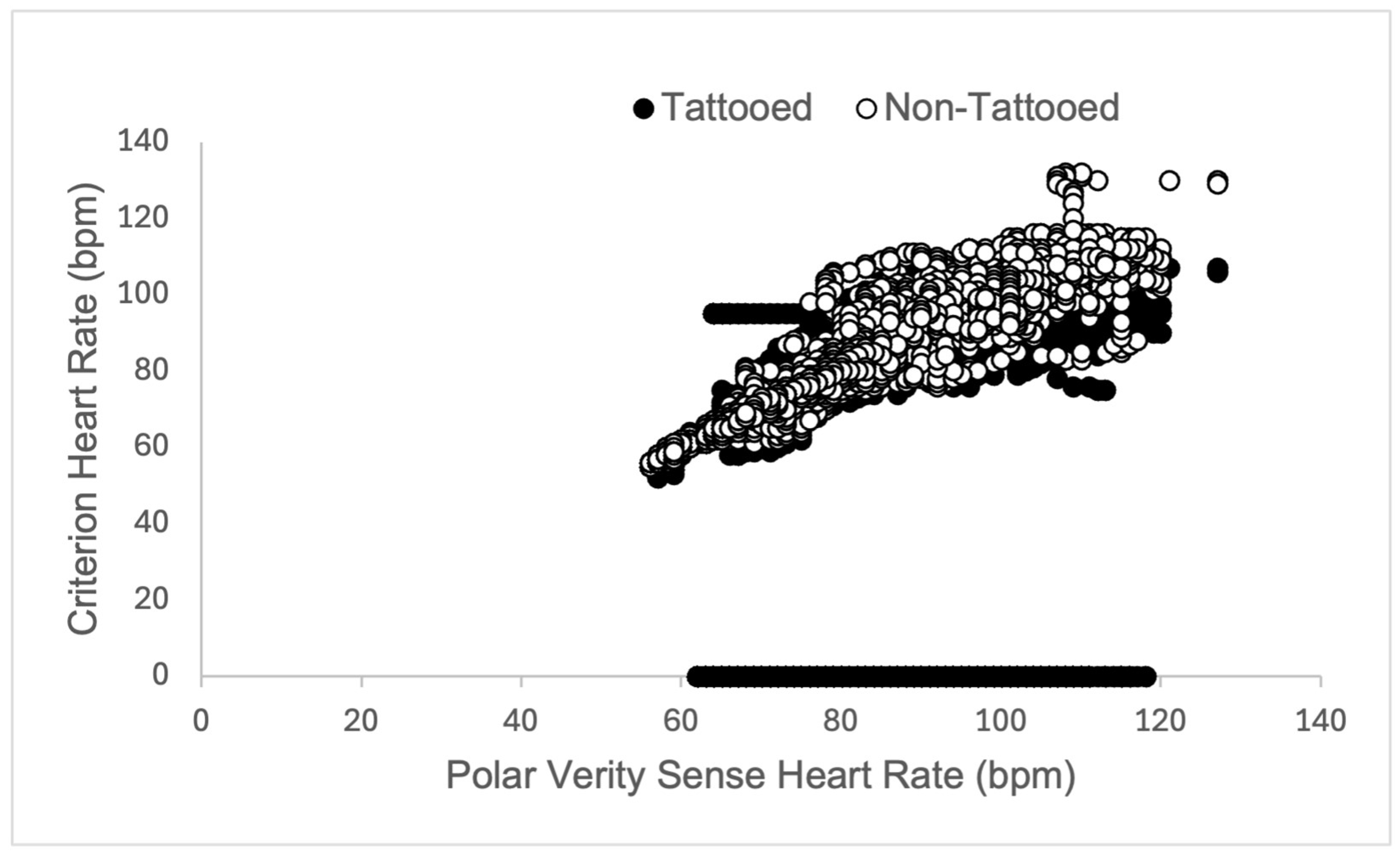 Figure 4. Graphical representation of Pearson Product Moment Correlation heart rate (measured in beats per minute, bpm) returned from the criterion sensor (Polar H10 chest strap) and experimental sensors (Polar Verity Sense) placed over tattooed skin (closed circles) and non-tattooed skin (open circles) on the upper or lower arm during a 5-min self-paced walk in adult participants (N = 25).