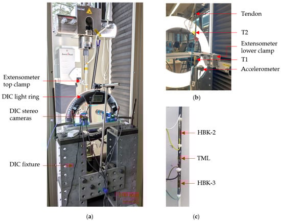 A second series of tests was conducted in February 2025 at Empa to assess the behaviour of three bonded strain gauge systems (HBK-2, HBK-3, TML), the multiXtens contact extensometer and DIC. Due to the lack of free surface on the tendon’s outer diameter, already equipped with three bonded foil gauges, a DIC paint patch and the clamps of the contact extensometer, it was not physically possible to glue an additional fibre optic. Three tendons were loaded in tension in a ZwickRoell Z250 loading frame (ZwickRoell, Ulm, Germany) as shown in Figure 2. The tendons were loaded at a rate of 4 mm/min to 54 kN, which corresponds to 88% of their UTS, and a calculated expected strain of 1.53%. All measurements were manually synchronised with the start of loading. The duration of loading was defined from the first series of tests which showed that a duration of 20 h was sufficient to develop the expected creep strain curve profile. One tendon failed after 4.5 h of sustained loading, due to the anchorage system failing; the other two tendons sustained loading for 20 h before the tests were terminated.