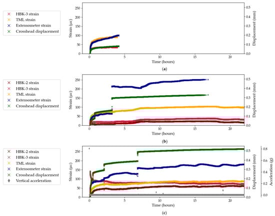 Strain and displacement data from Test Series B: (a) Test B1; (b) Test B2; (c) Test B3.