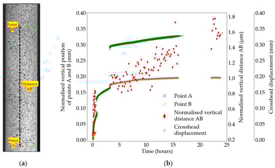 Figure 5 shows the tracking by DIC of the position of two vertically aligned points A and B on the Region of Interest (ROI) of the sample in Test B2. As shown in Figure 5b, the two points experience a shift in their vertical position, normalised to their respective starting position, between the first and the fourth hour of testing. More importantly, both points move by the same distance of 0.15 mm, which corresponds to the cumulative distance of the jumps in crosshead displacement at the first and the third hour of testing. Consequently, the vertical distance between points A and B maintains a gradual increase in magnitude throughout the test, independent of the jumps in crosshead displacement. For clarity, only one data set is presented in Figure 5; however, this validation check has been applied to all DIC data sets before computation of strains.