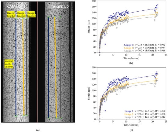 Test B2, DIC results: (a) position of the gauge length on the region of interest; (b) strain data using pre-test calibration parameters with logarithmic trendlines; (c) strain data using post-test calibration parameters with logarithmic trendlines. The lack of data between hours 1–3 and hours 16–23 corresponds to interruptions in the DIC image capture system.