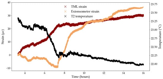 The results from Test B3 are presented in Figure 11 for the extensometer and the TML foil gauge, for the overall test duration (Figure 11a,d), between the 1st and 6th hour of testing (Figure 11b,e), and between the 12th and 22nd hour of testing (Figure 11c,f), to zoom on noteworthy behaviours. During the first 6 h of testing, the extensometer records a constant, albeit not smooth, increase in strain (Figure 11c) while the strains recorded by the TML gauge appear to mirror the temperature curve both in phase and magnitude (Figure 11b). In Figure 11c,f, the T2 temperature detector recorded periodic 2-hour temperature cycles which were attributed to the ventilation cycles in the testing laboratory at Empa. Similarly to the previous time range, the TML foil gauge seems to capture temperature variations accurately and consistently while the extensometer exhibits a less defined temperature sensitivity, with variability both in phase lag and magnitude. In addition, the zoomed in graphs highlight the wider range of temperature-induced strains recorded by the extensometer, compared to the strains recorded by the bonded TML gauge, thus underlining the apparent greater temperature sensitivity of the contact extensometer compared to the bonded TML gauge. For example, over the first 6 h of testing (Figure 11b,e), for the same temperature profile, the strains recorded by the TML gauge and the extensometer spanned a range of 14 and 48 με, respectively.