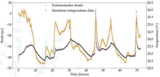 To better assess the temperature sensitivity of the extensometer, and remove potential thermal effects induced by loading, a dummy test was conducted on one CFRP tendon from the same manufacturing batch as the tendons used in Series A and B, loaded at 1 kN for 72 h. The strain was measured by the same contact extensometer as in previous tests, using the same testing parameters, and the temperature was recorded by the same Sensirion sensor. As shown in Figure 12, the strain measured by the extensometer follows the general variations in temperature however a phase lag is still present. Figure 12 also confirms the great sensitivity of the extensometer to changes in temperature. For example, in the first 16 h of testing, the absolute temperature variation is 0 °C (i.e., the difference between the strain values at the start and end points) but the extensometer records a decrease in strain of 45 με.